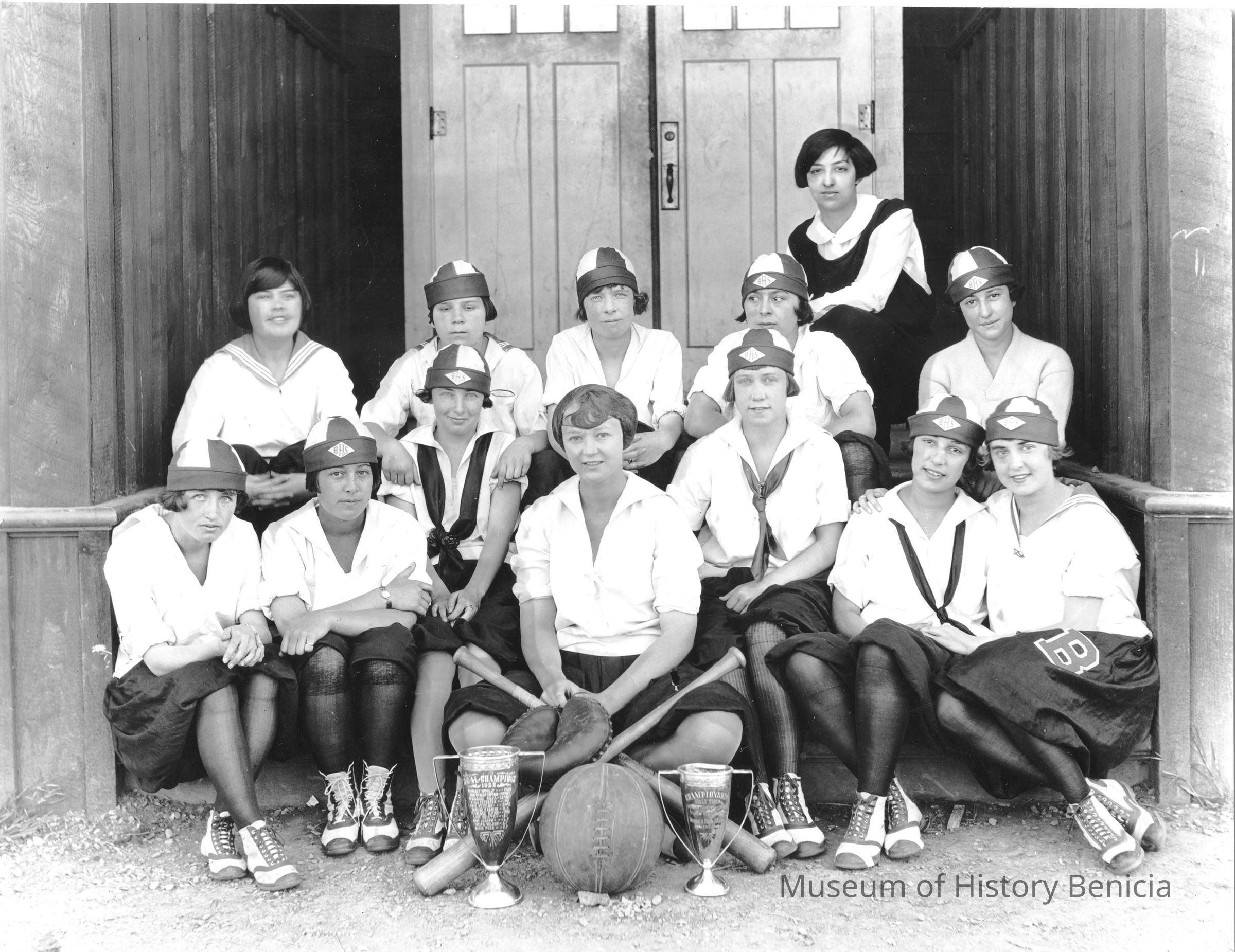 Photo of a girls Benicia High School baseball team with trophys. The date on the trophy is 1922.