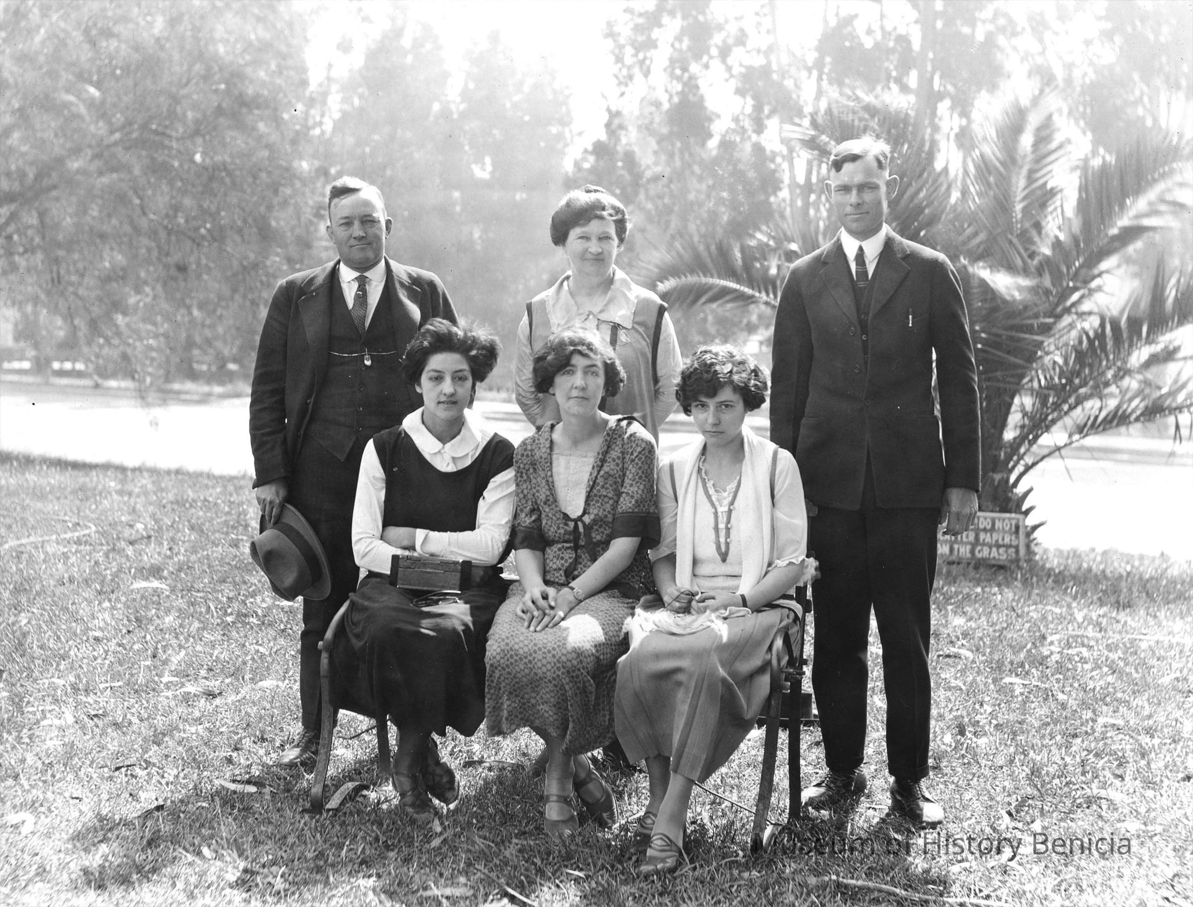 Photo of six people sitting/standing outside. It looks like they are in the park (there is a sign in the background asking people not to litter).Collection