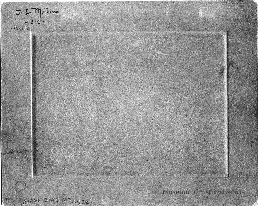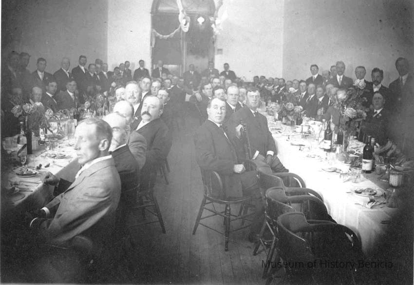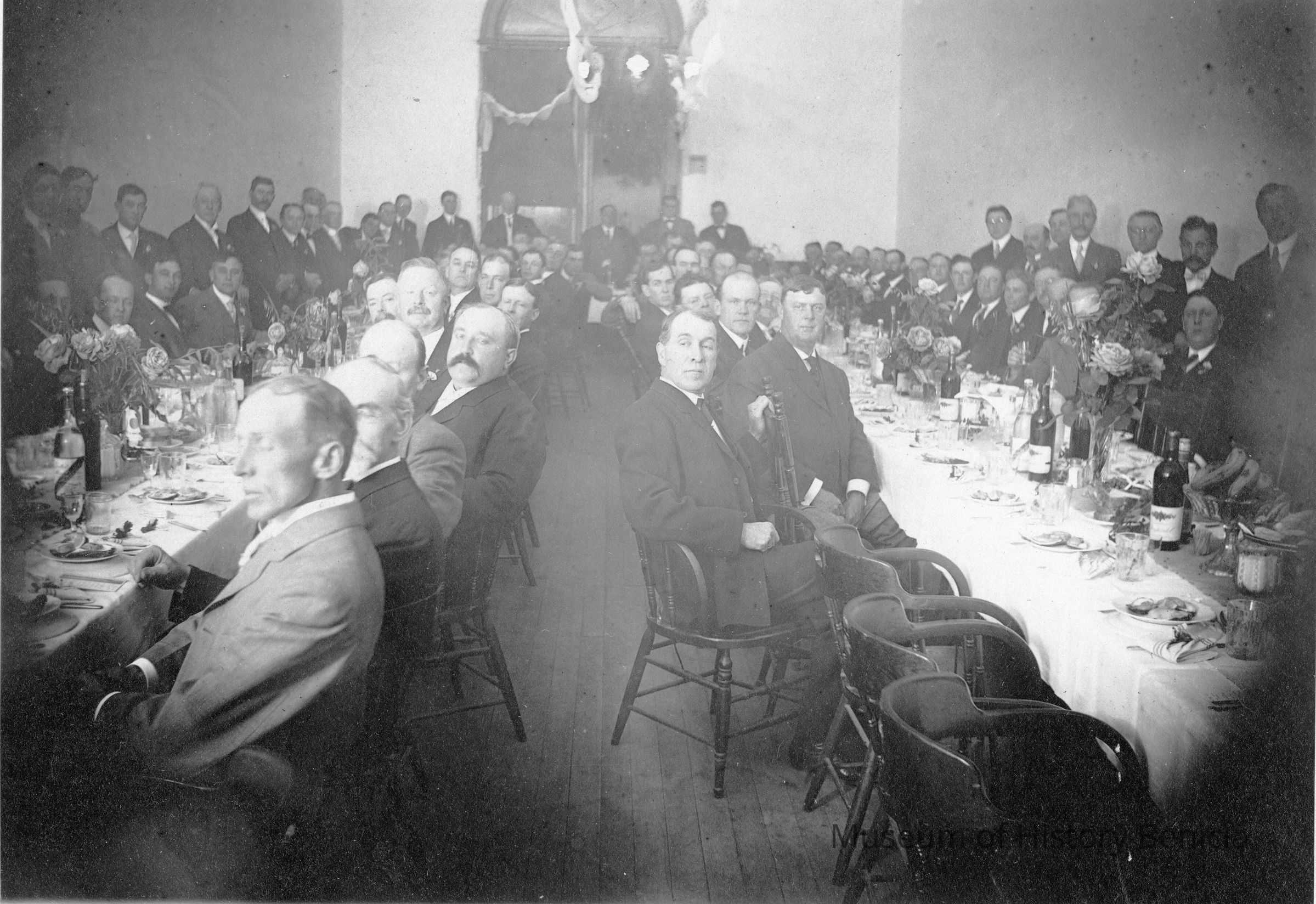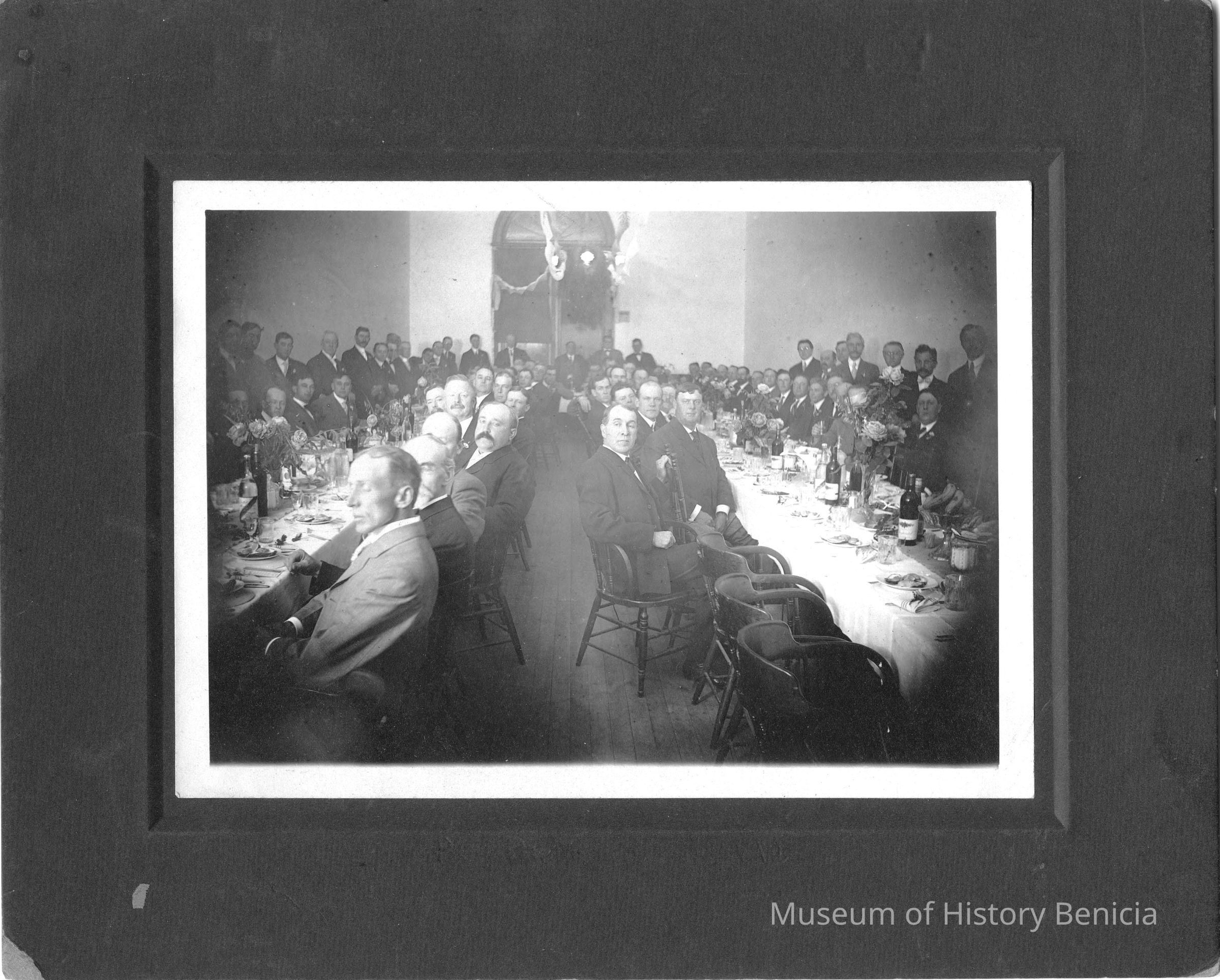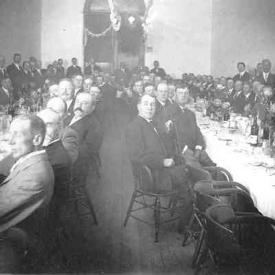 Photo of people at a luncheon. The photo is on a black cardboard frame. Written on the back is "J L Molfino" "-1912-". May be John Molfinos handwritting.Collection