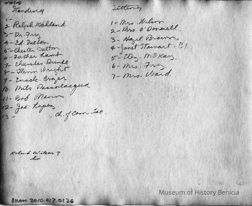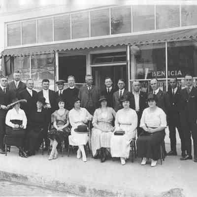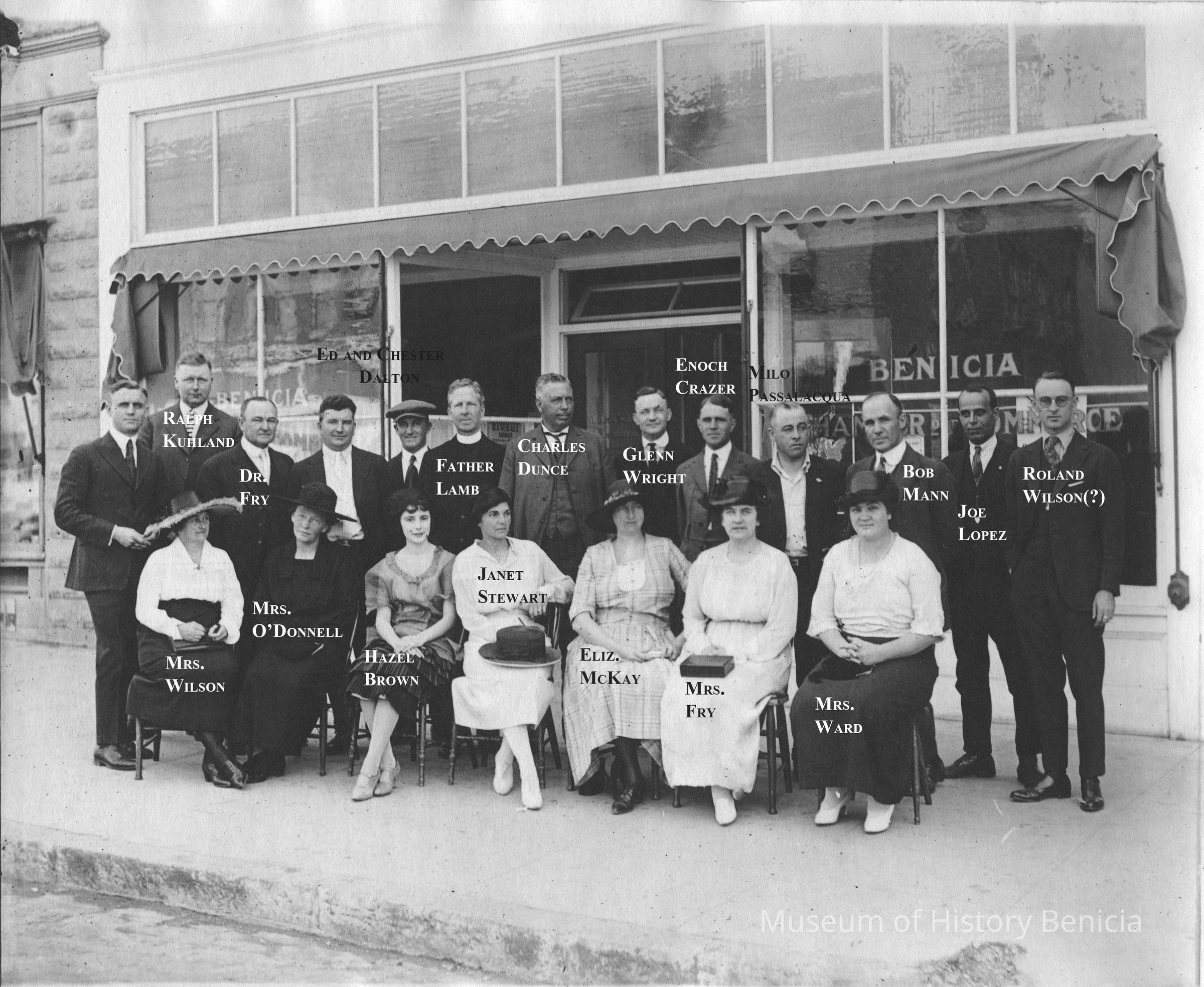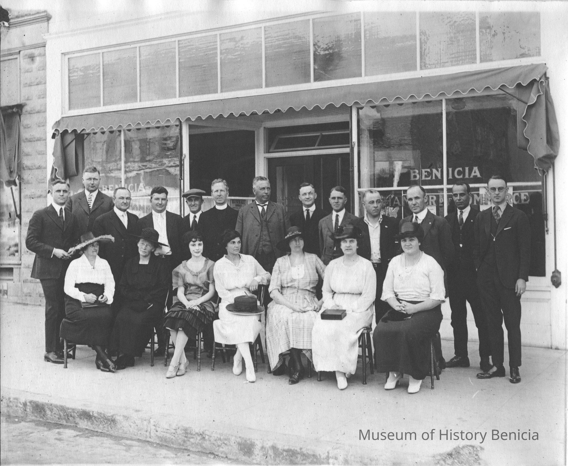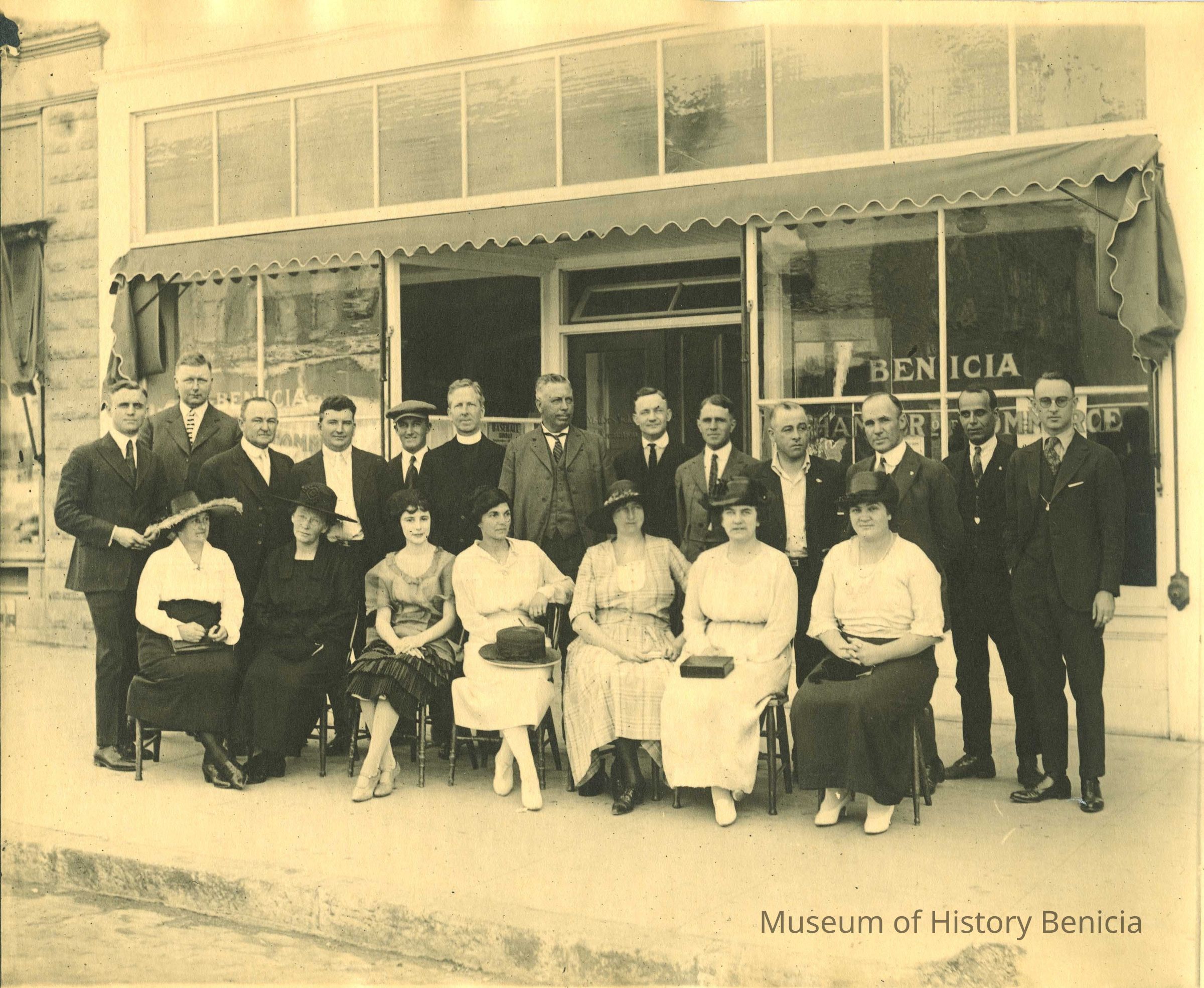 Photo of people sitting/standing in front of the Benicia Chamber of Commerce. This is the same photo as 2010.017.0126 and that coy as names written on the back.