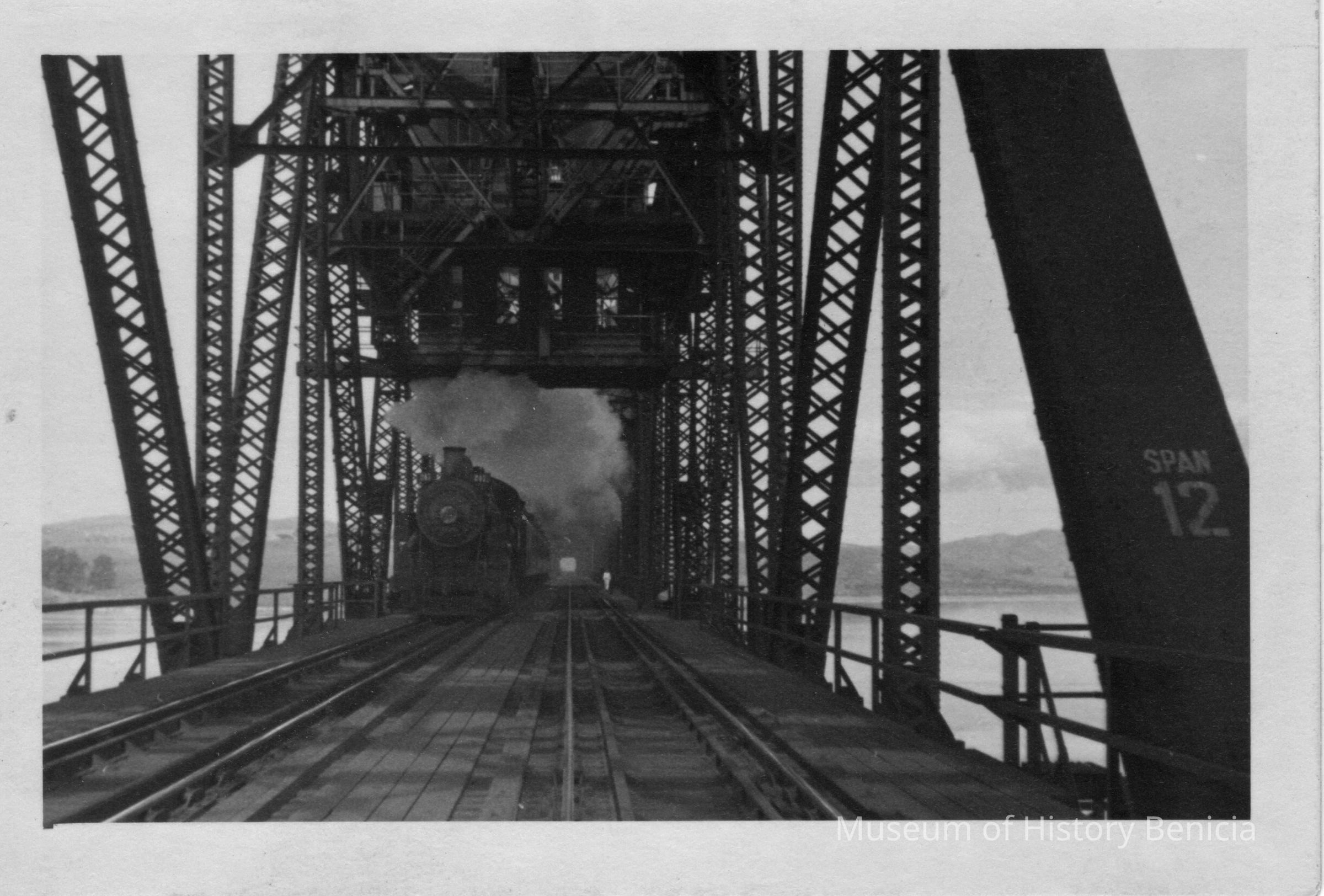 Photo of a train crossing a bridge. This is probably the Benicia S&P train bridge.