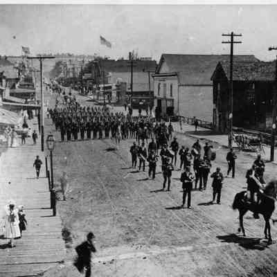 Photo of a parade on First street. Shows marching band and military marching.
