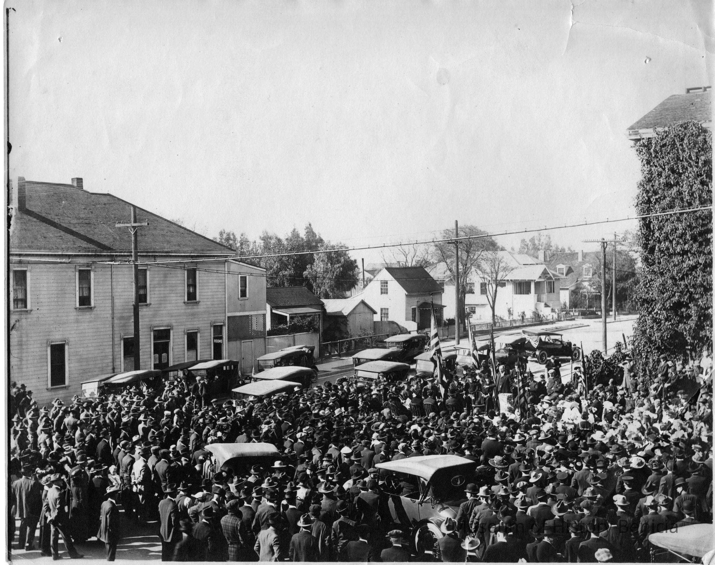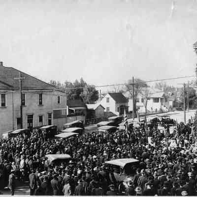Photo in front of the Old Capitol with cars and a large crowd. Probably a recruitment drive for WWI.