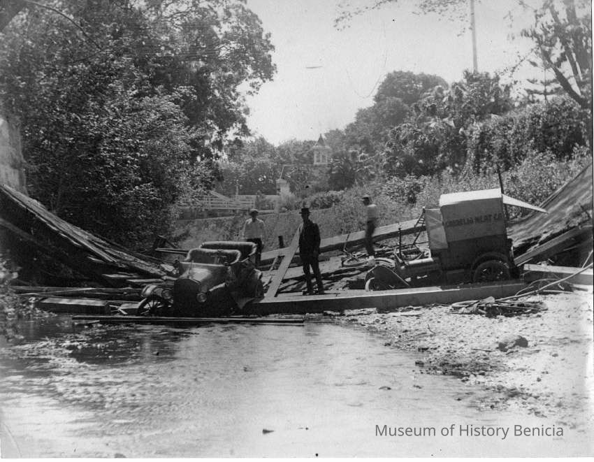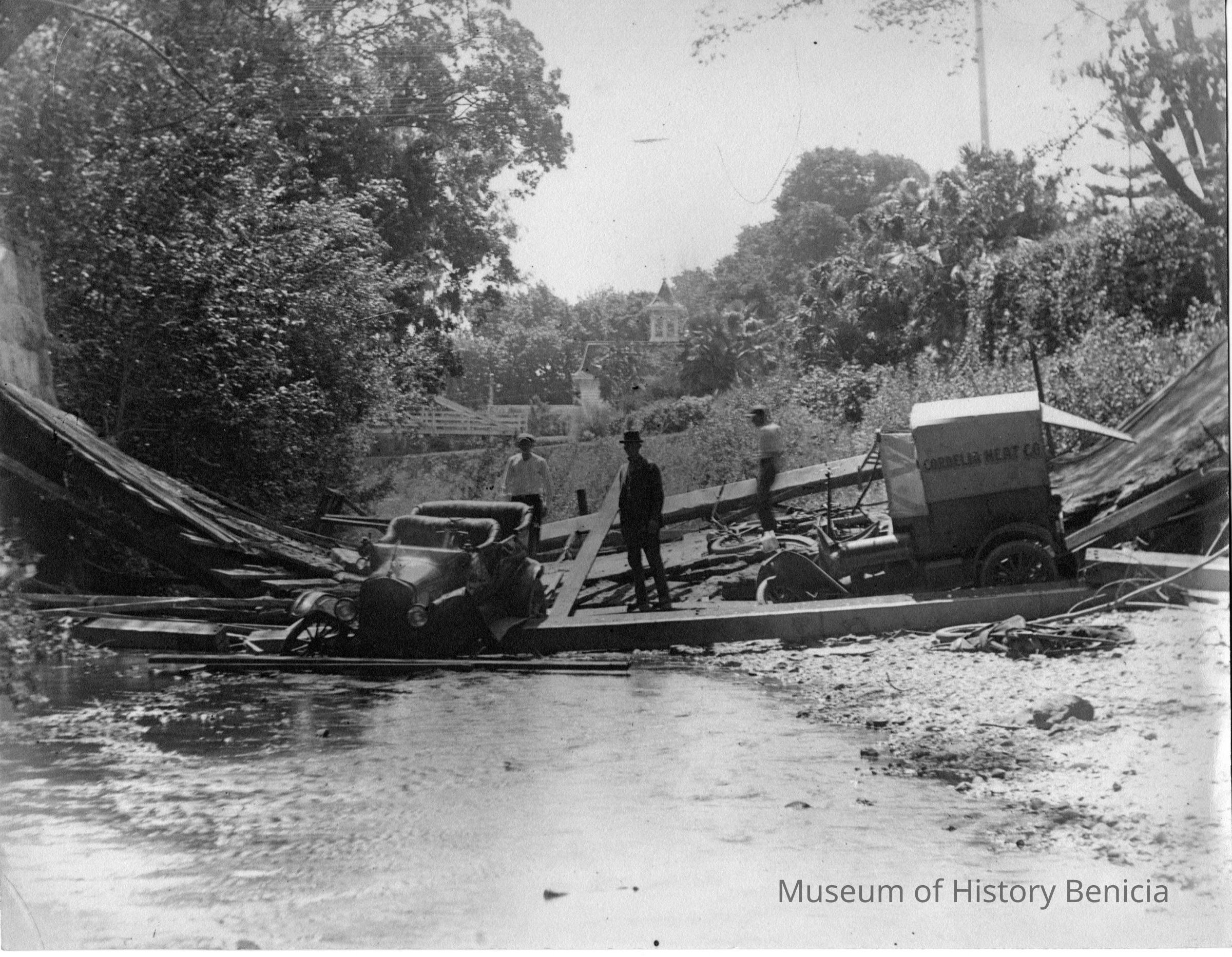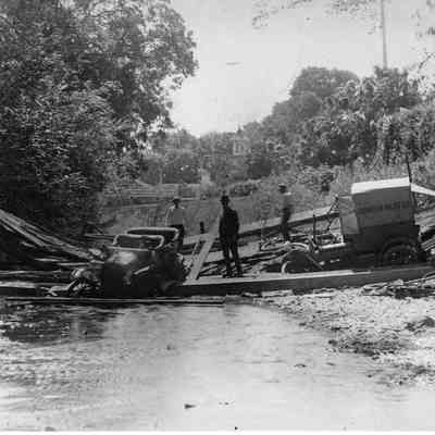 Photo of a car on a broken bridge in the stream. Also a truck with the sign on the side "Cordelia Meat Co.".