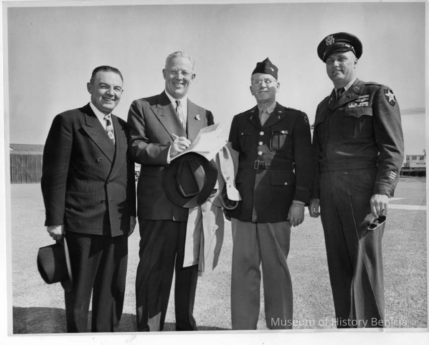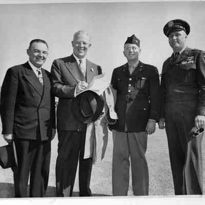 Photo of a ceremony. Shows two military men and two guys in suits in a parking lot or air field.