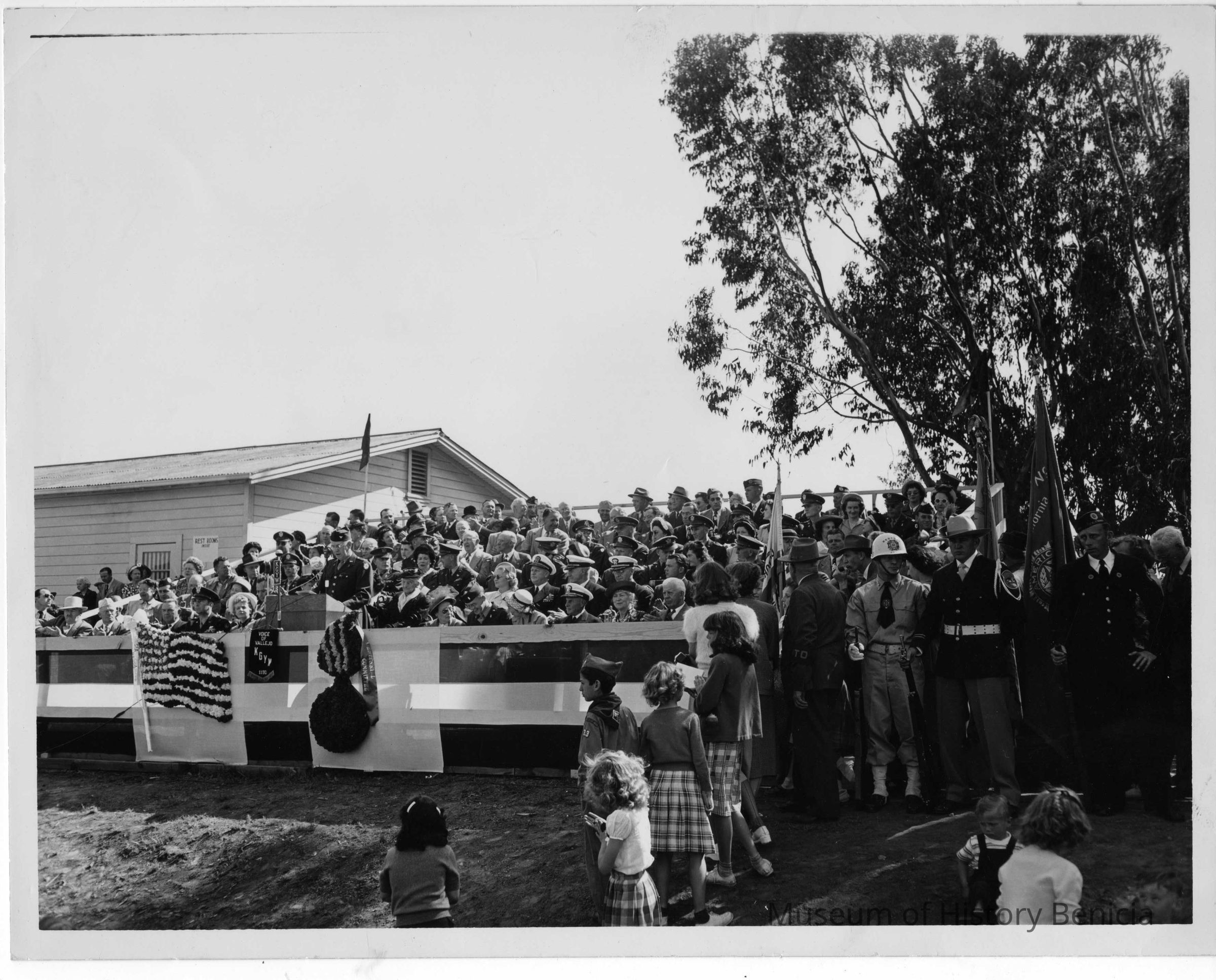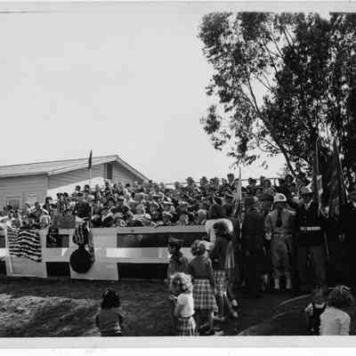 Photo shows a crowd behind a podium and others in front of the podium. There are military guards. Has a banner for the "centenial committee" next to podium.Collection