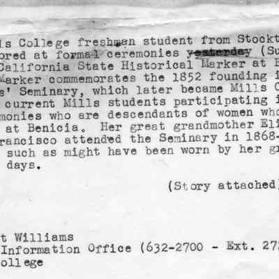 Newspaper photo of the dedication ceremonies for the California State Historical Landmark honoring the 1852 founding in Benicia of the Young Ladies Seminary -- forerunner of today's Mills College (May 2, 1965). Given to Jack O'Grady by Benicia Herald editor Marcus Griffin.
