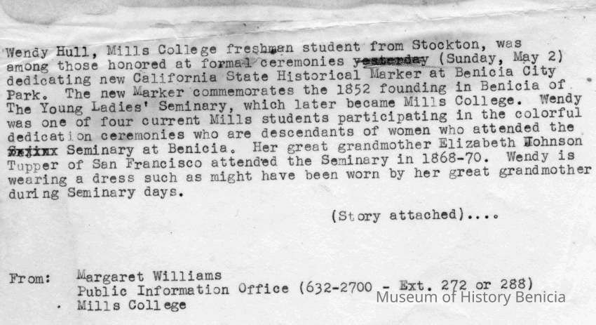 Shown in the photo is Wendy Hull of Stockton one of four current Mills College students who are decendants of early Benicia Seminaray students. Her great grandmother Elizabeth Johnson Tupper of San Francisco attended the Seminary in 1868-1870.Collection