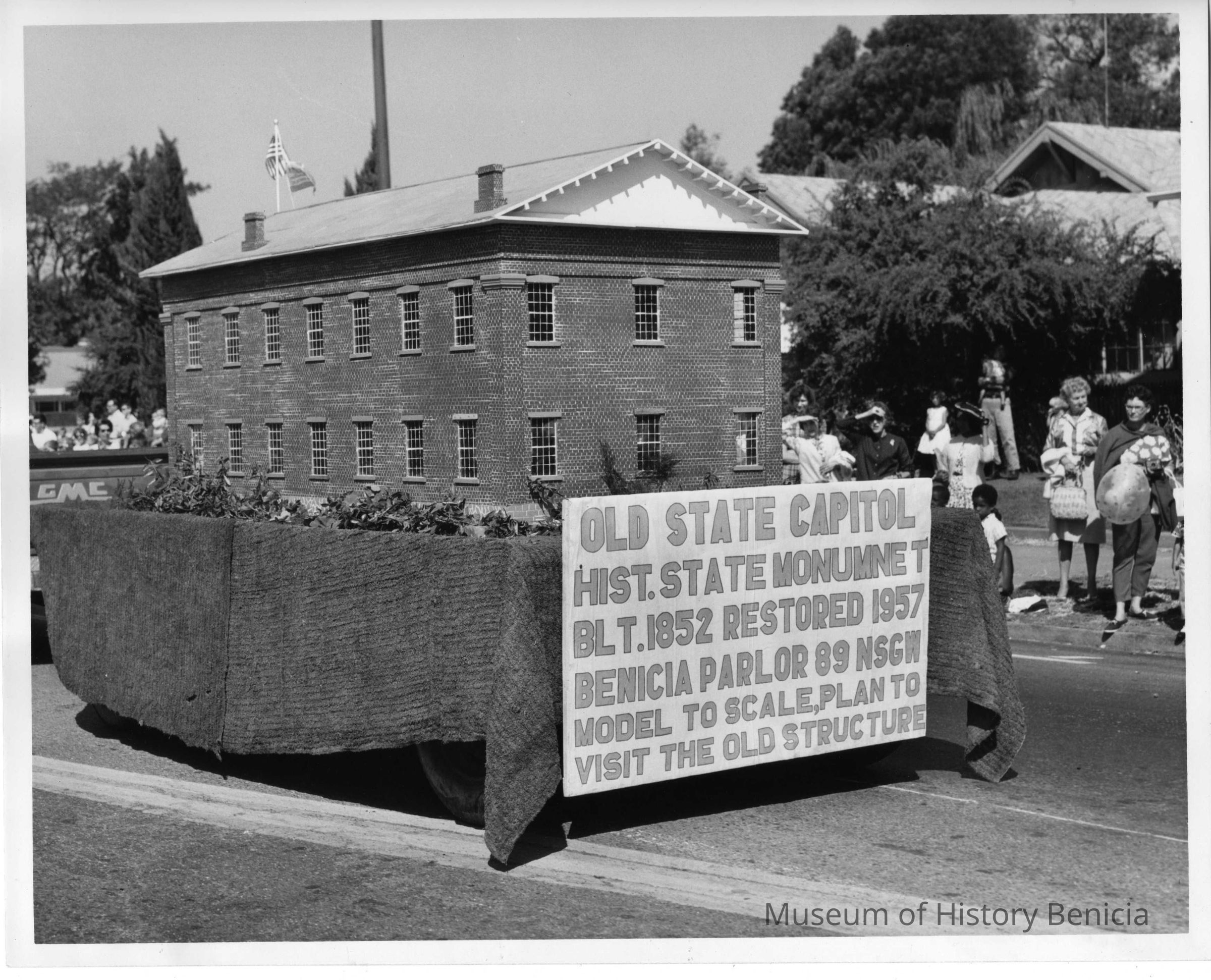 Newspaper photo of a scale model of the Benicia State Capitol. Built by Benicia Parlor 89 NSGW.