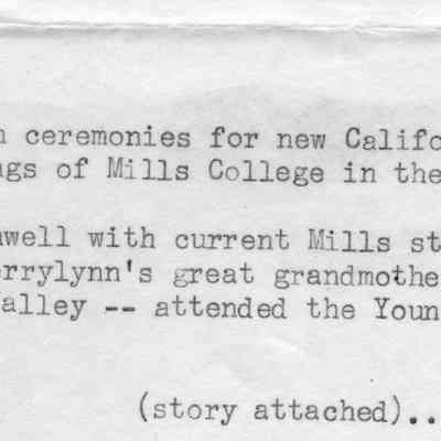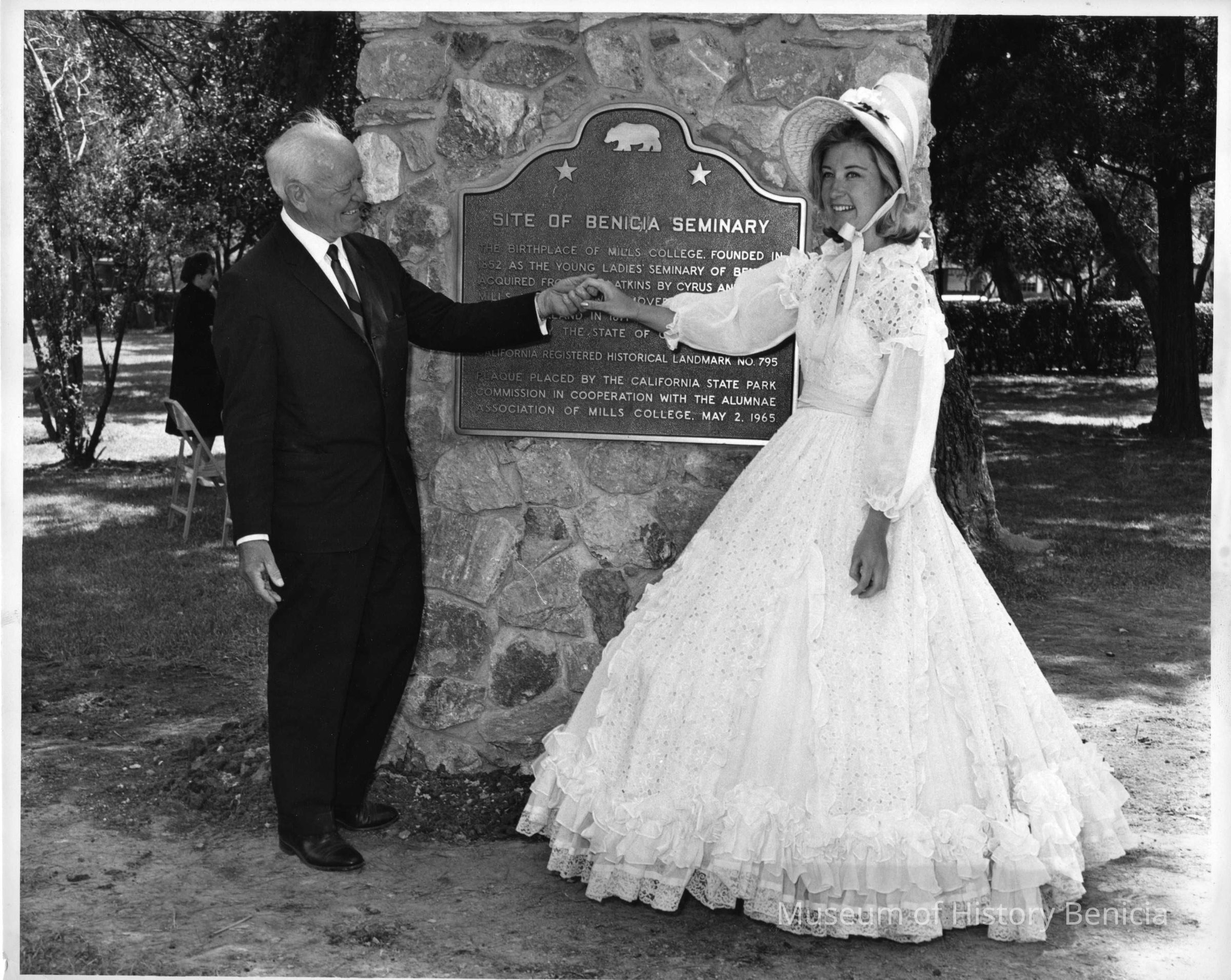 Newspaper photo of the dedication ceremonies for the California State Historical Landmark honoring the 1852 founding in Benicia of the Young Ladies Seminary -- forerunner of today's Mills College (May 2, 1965). Given to Jack O'Grady by Benicia Herald editor Marcus Griffin.