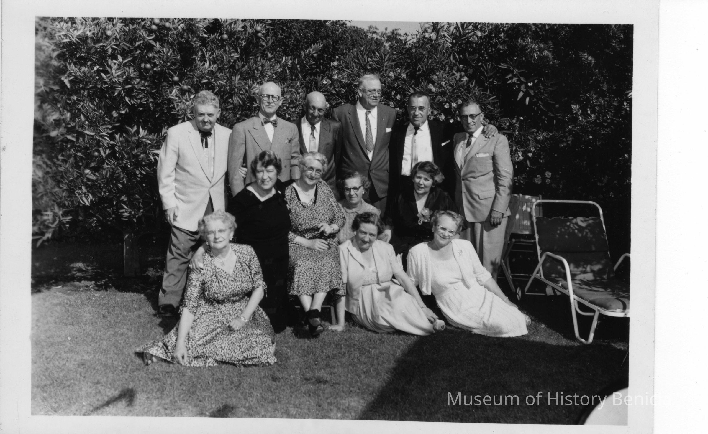 Photo of people attending the reunion of the 1911 Benicia Grammar school. There are seven copies of the same photo in an old O'Grady's Drug Store photo envelope dated 12/15/1955Collection