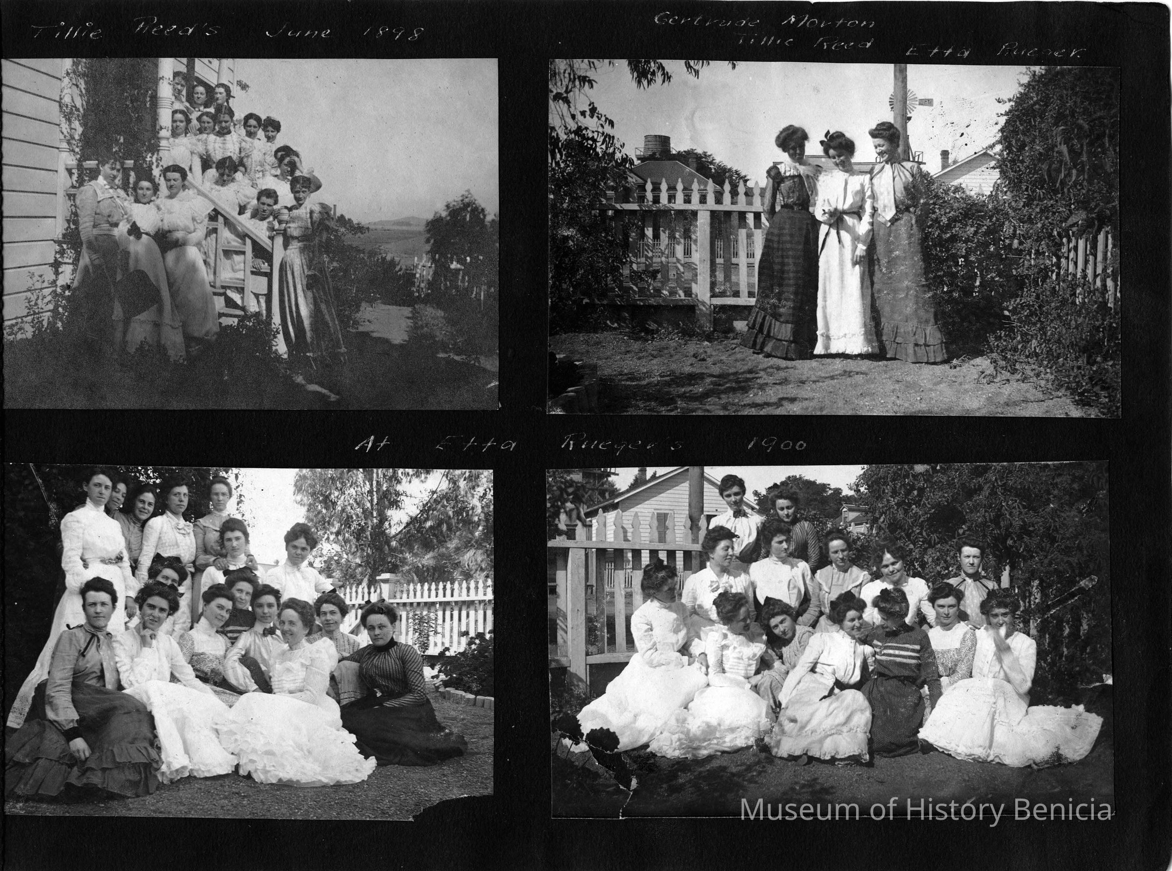 - Sixteen girls standing on porch and in garden, with Caption: "At Tillie Reed's, June 1898".