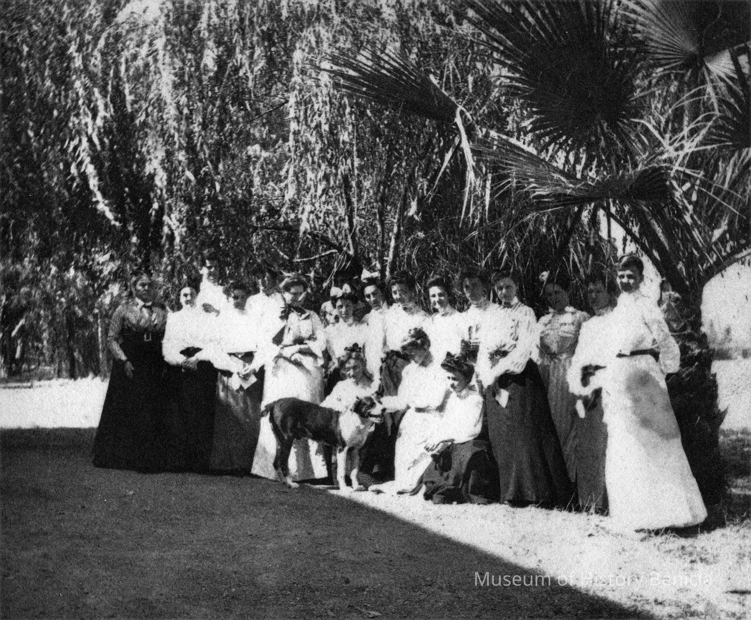 Photograph from album page. Group of women stand outside under a palm tree. Dog in front of them. Caption reads, "Afternoon at Hoyts. Sept. '03."Collection