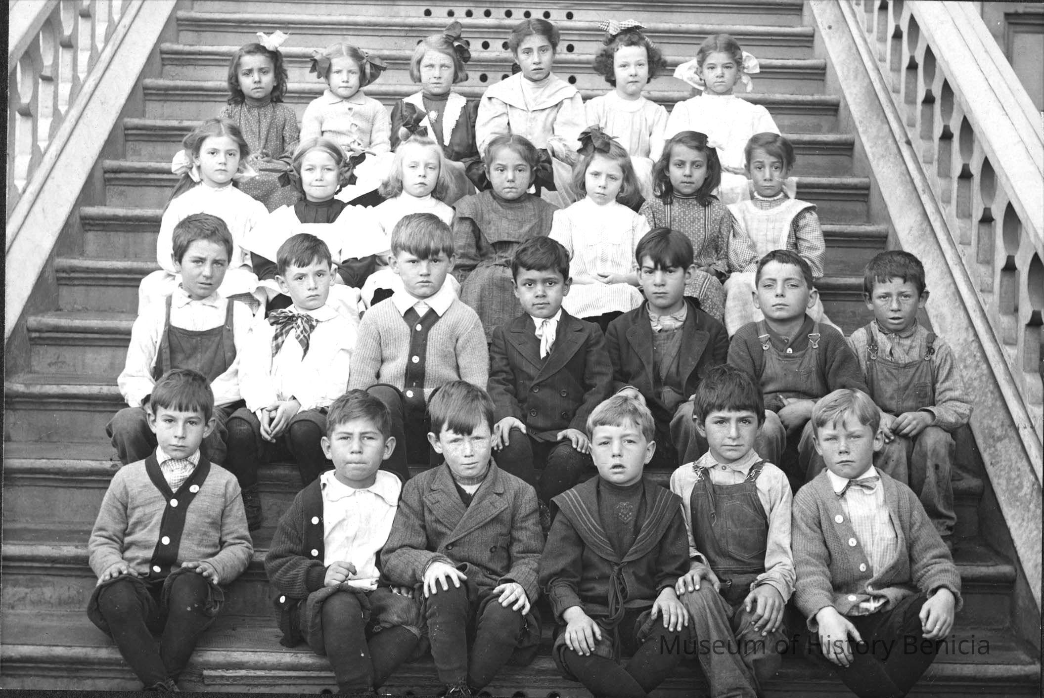 Grade school kids on steps of school in Benicia. Girl in top row on right is Marguerite Molfino who was born in 1902.