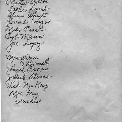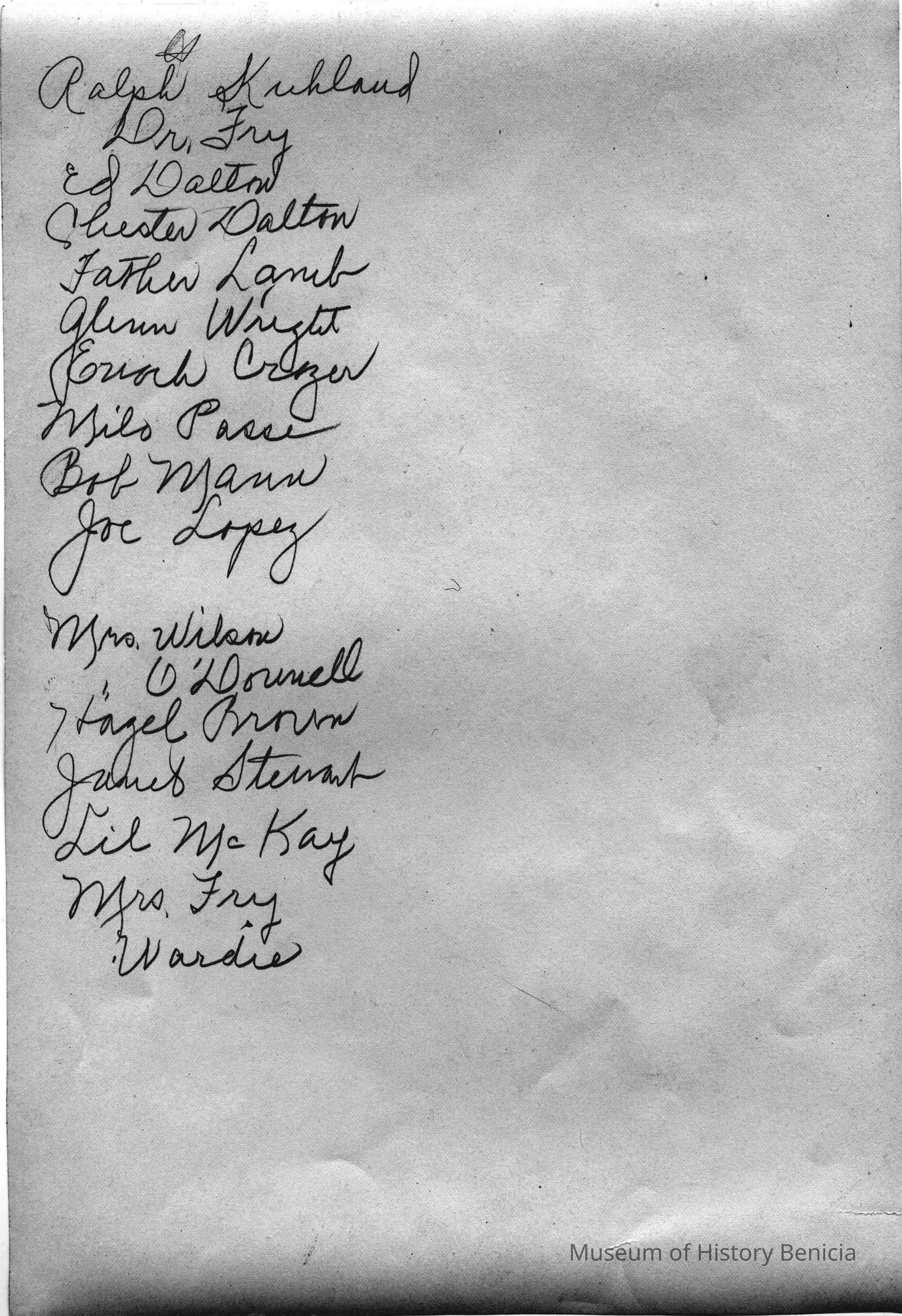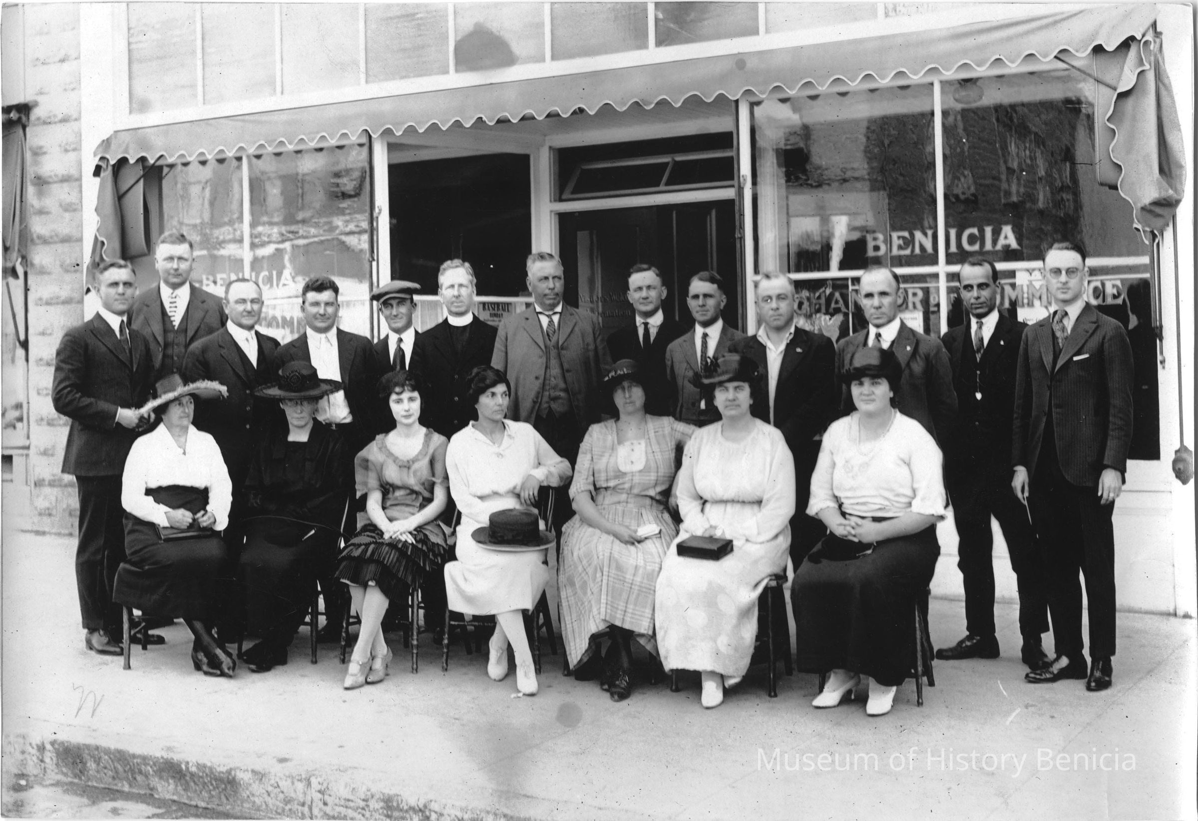 Photo of Benicia Chamber of Commerce. No sign overhead. The names of most of the people in the photo are written on the back.