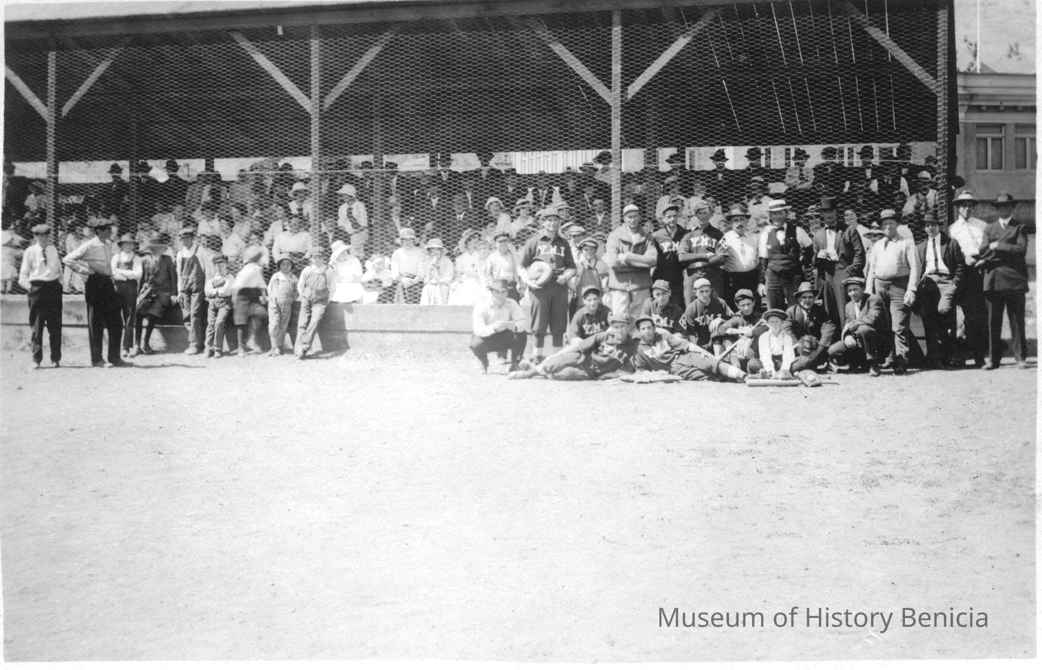 Baseball photo. Most have shirts for YMI (Young Men's Institute). They are playing on a field near a large building. Doesn't look like the same building as in 2011.002.0013. Not sure???Collection