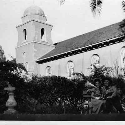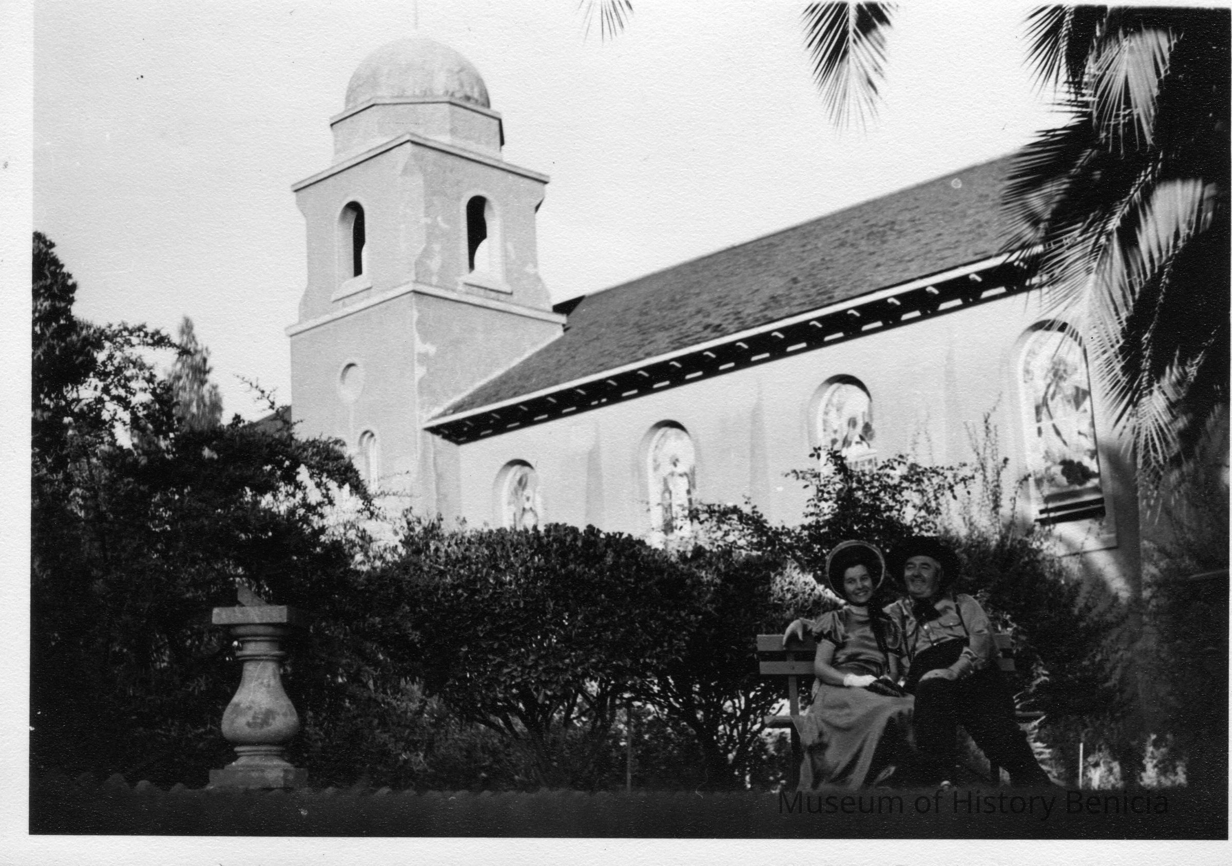 the man in the photo is Jack O'Grady, he and the young woman are dressed in what appears to be period dress, perhaps for the dedication of St. Catherine's since the building in the rear is St. Catherine's Chapel.Collection