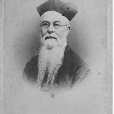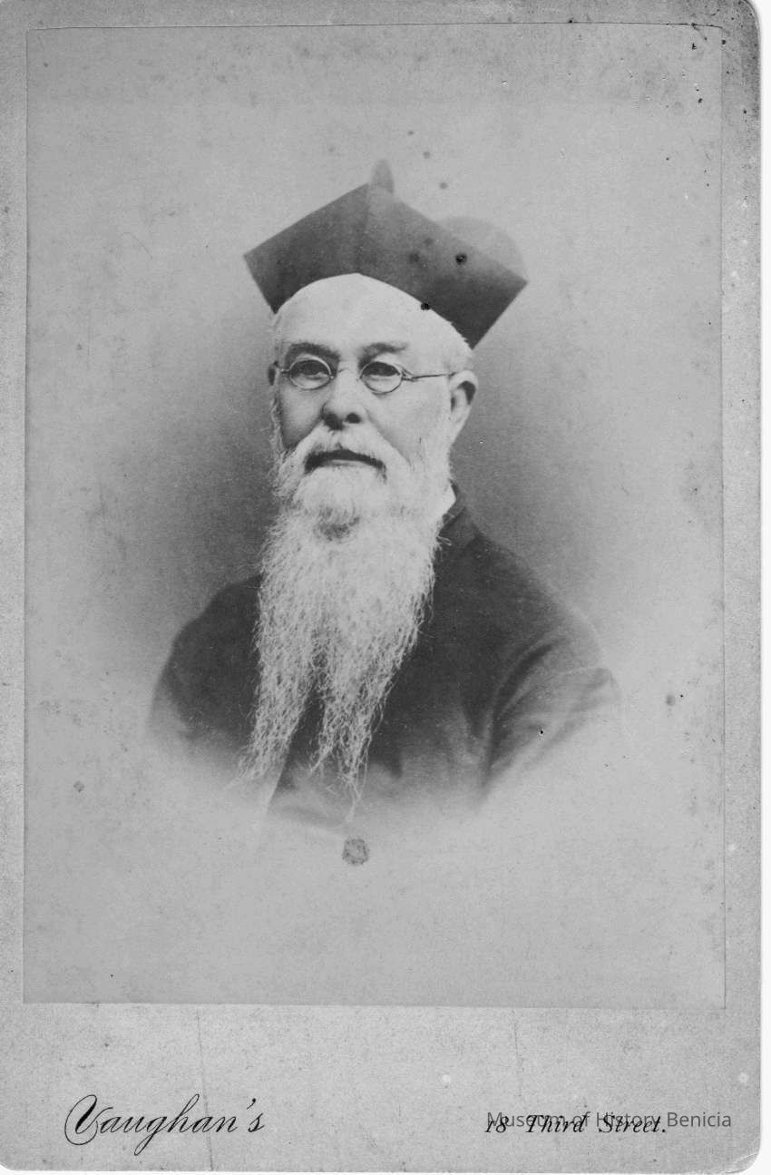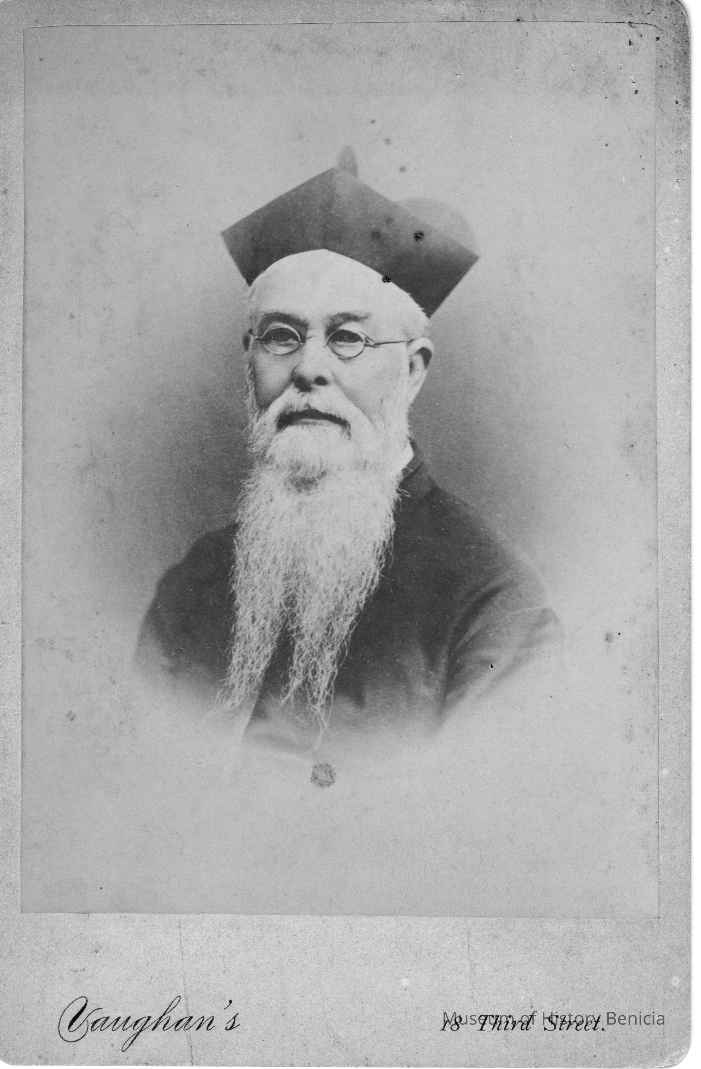 Slightly faded photo of a man with a long beard, glasses, and hat. Back of the photo states that it is from Photograph Gallery, M. Karras, Prop. located on 18 Third Street, Near Market, San Francisco, Cal. The front of the photo shows "Vaughan's" as the studio.