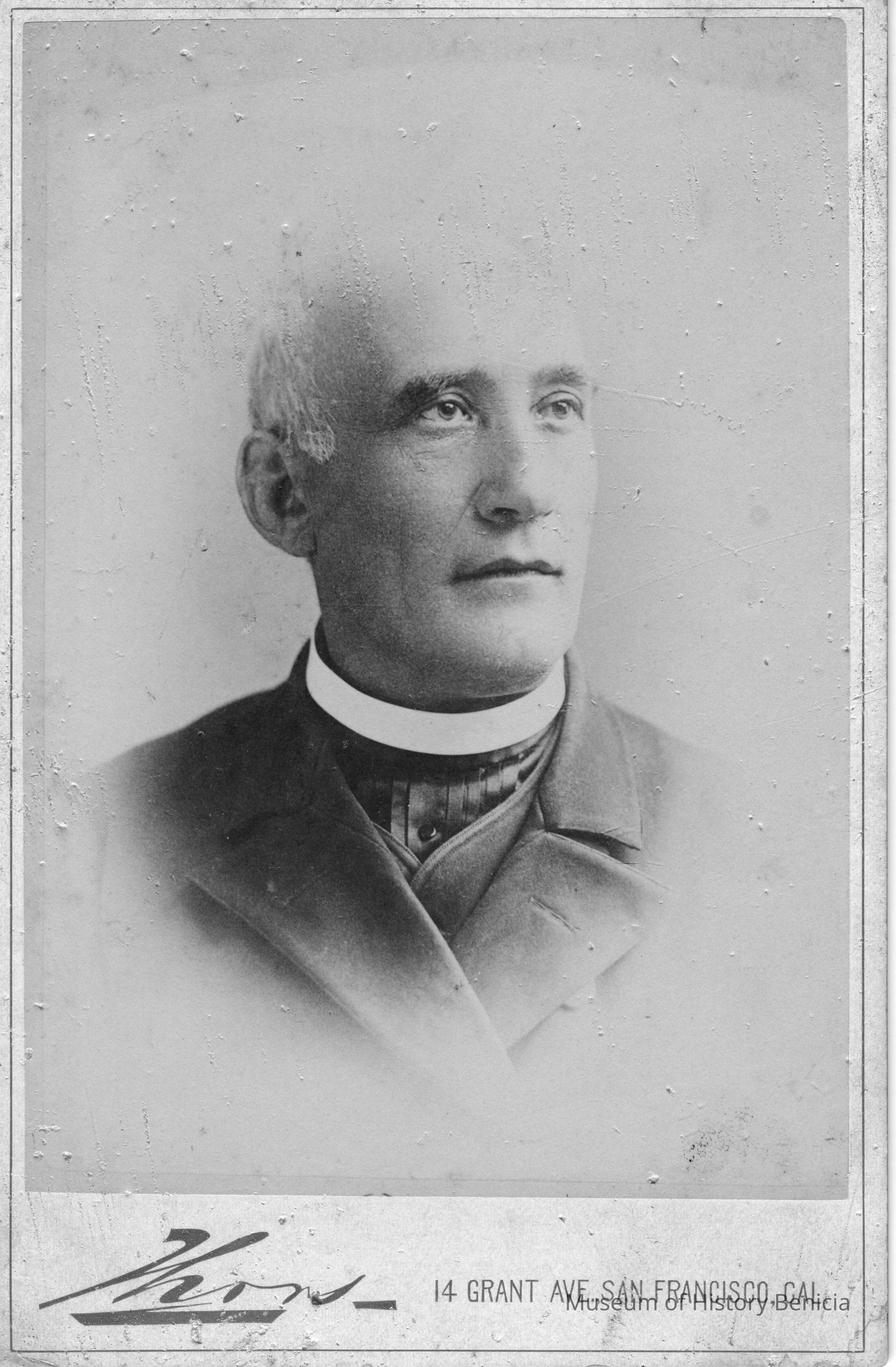 Slighly faded photo of a man done at a studio. At the bottom, gives address "14 Grant Ave., San Francisco, Cal". Photography studio is Kors(?)Collection