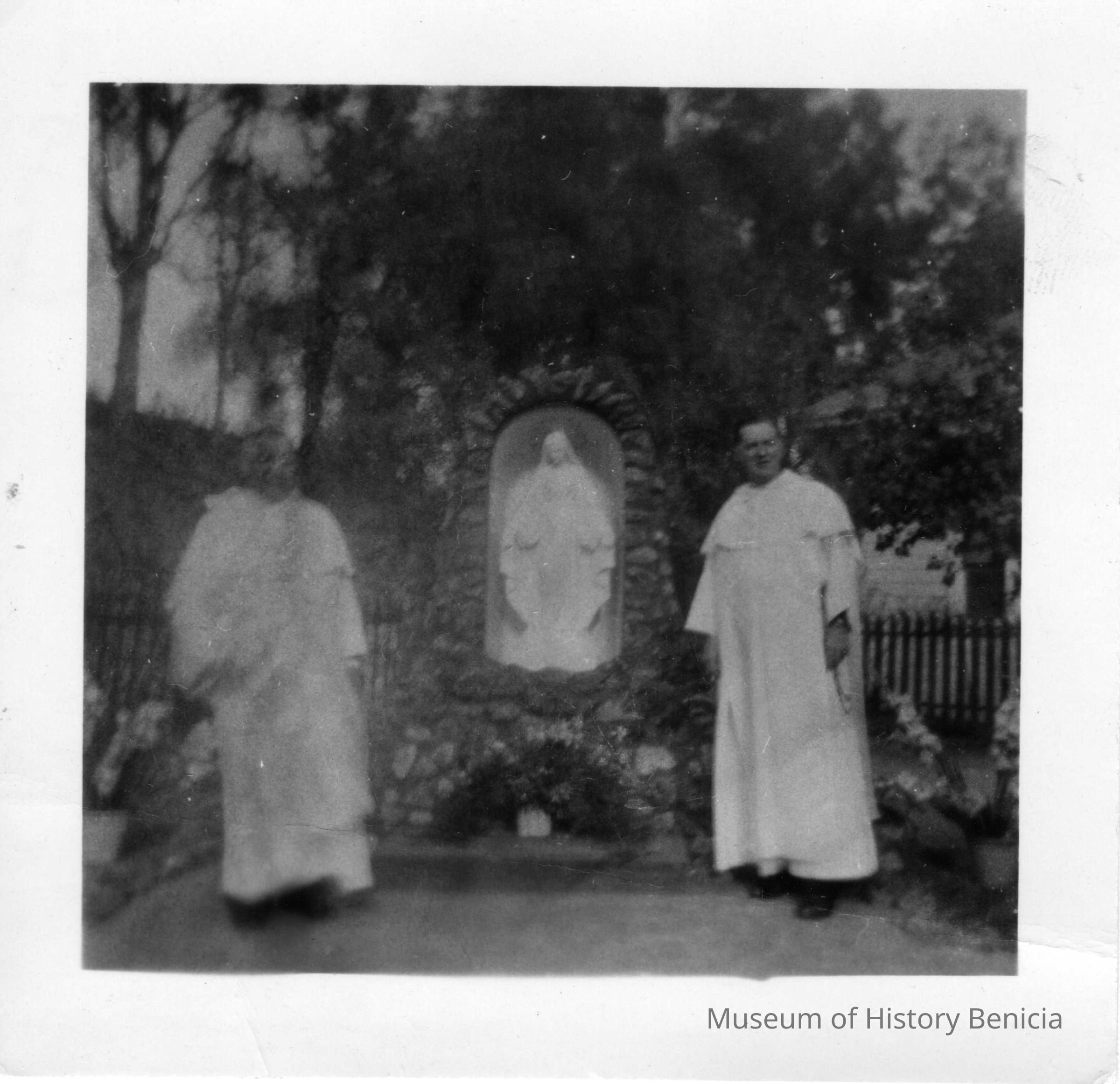 Picture of a statue in a garden, with two men, Dominican Priests, in a St. Catherine's garden.