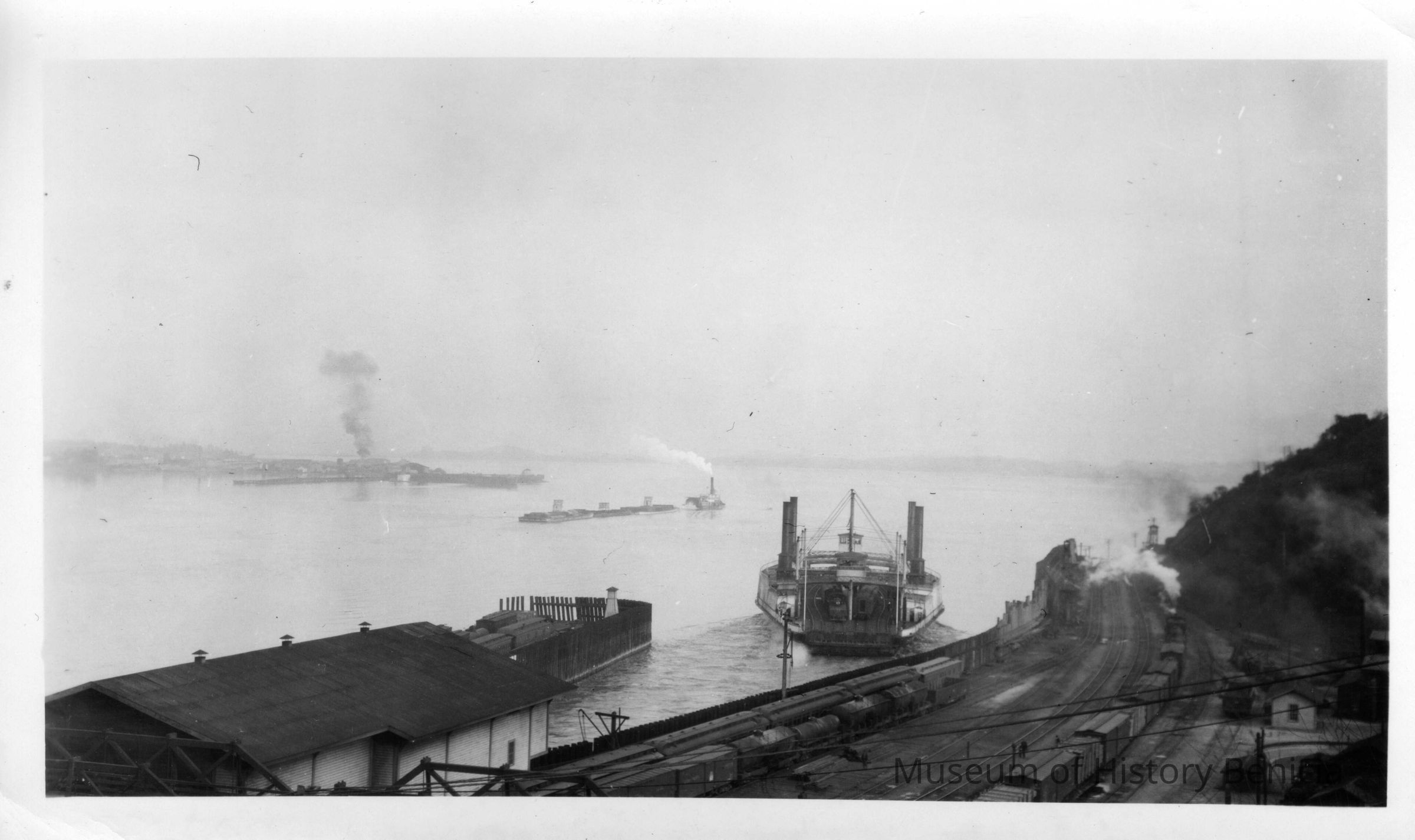 Photograph of the water. Train tracks running across the land, possible train depot, and several ships on the water. One train is coming in as if to dock, and because a large number of these photos are of the Solano, it is possible that it is the Solano. It does look to be carrying trains on it. Land can be seen across the water; it is Benicia.