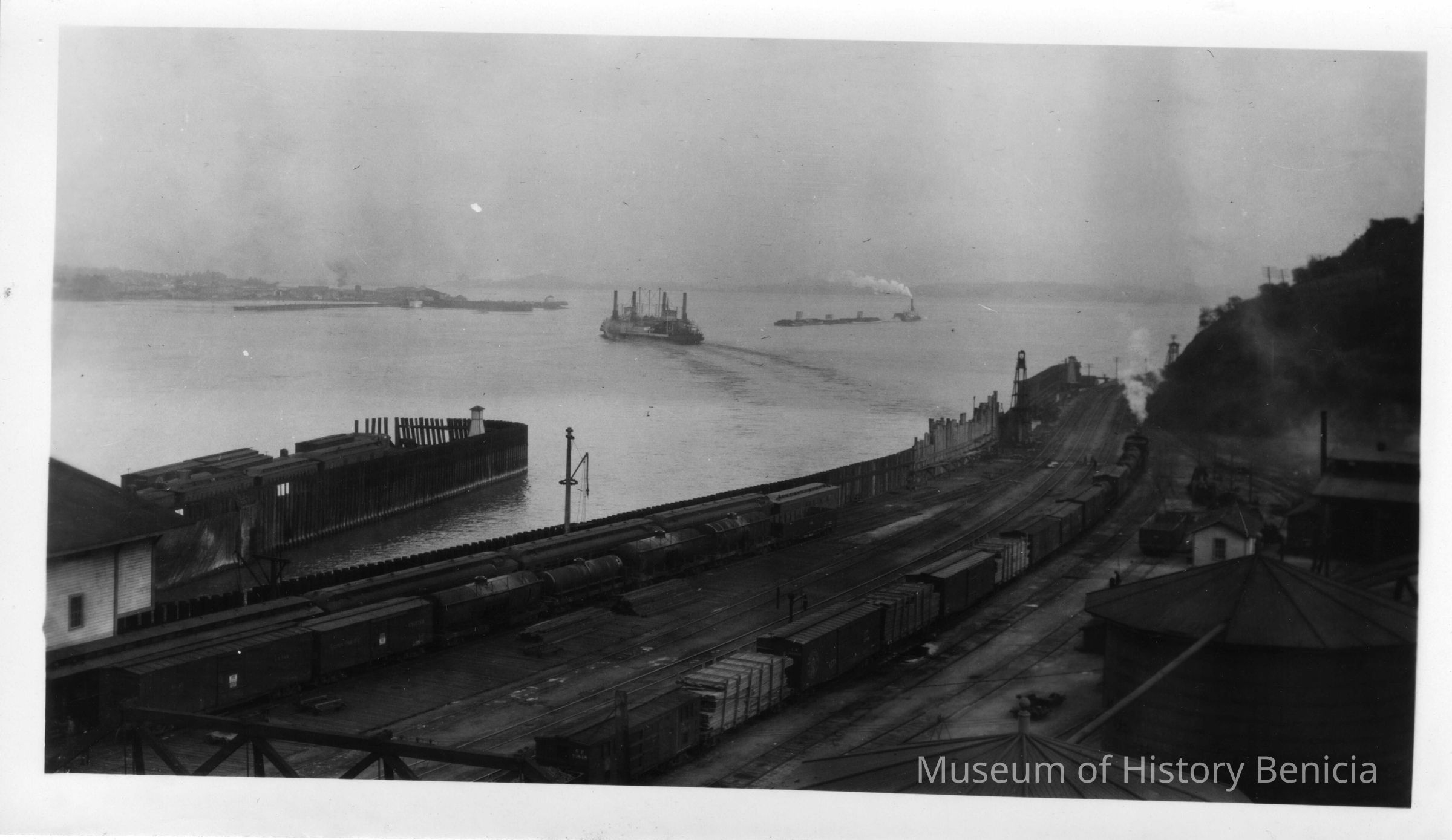 Photograph of the water. Train tracks running across the land, possible train depot, and several ships on the water. Train is steam-powered. Because a large number of the following photos are of the Solano, it is possible that one of the ships is the Solano. Land can be seen across the water which is Benicia as this photo is of the Contra Costa side.