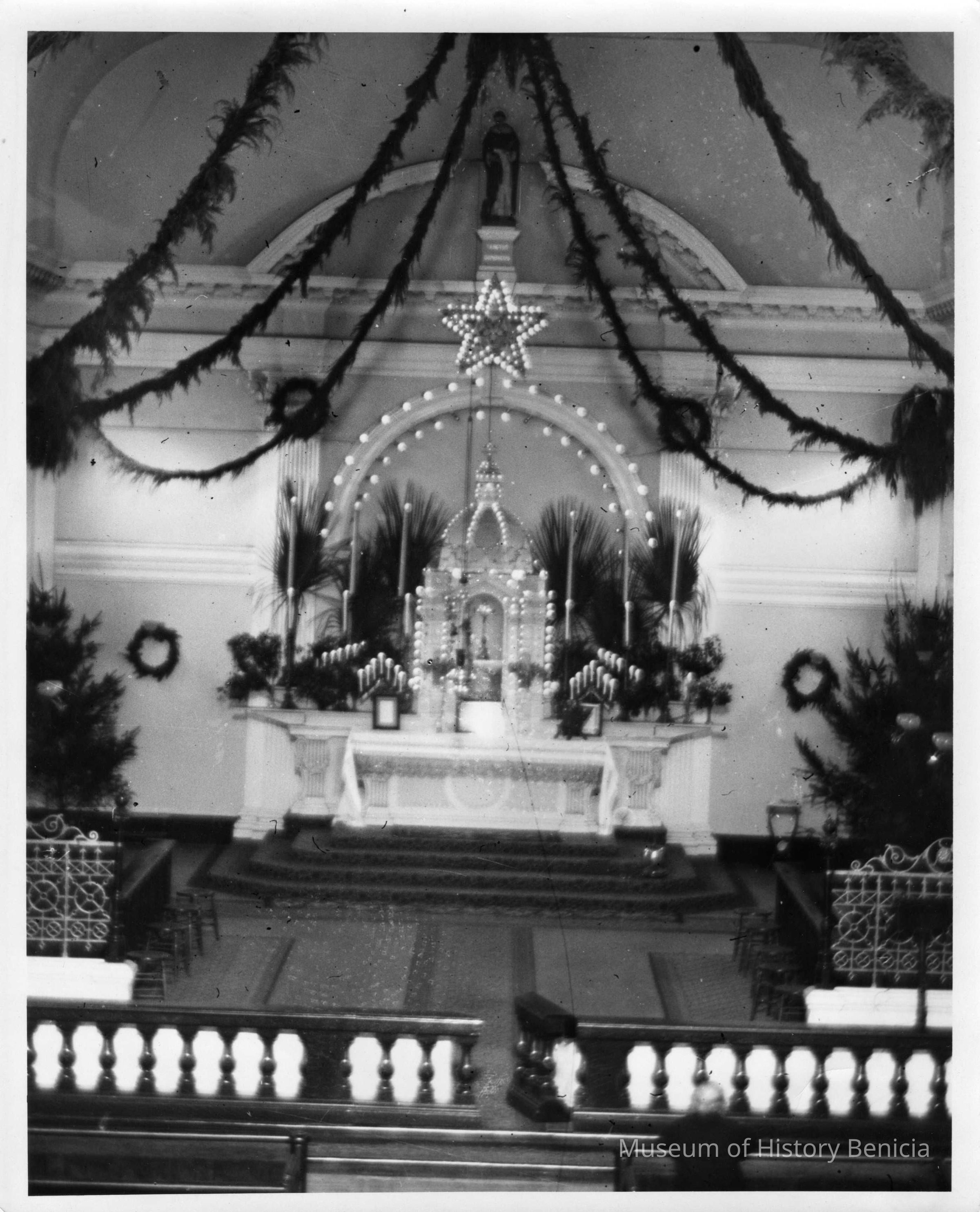Photograph of St. Dominic's church decorated for Christmas. Boughs hanging from the ceiling and the altar is lit and decorated. Can see a few of the pews.