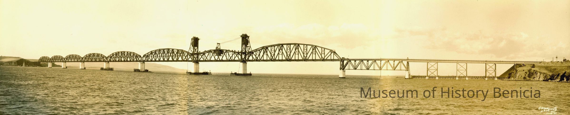 Photograph of Suisun Bay Bridge being built. This is a panoramic photos where three small photos have been tapped together.Photo signed by photographer C M Kurtz.Collection