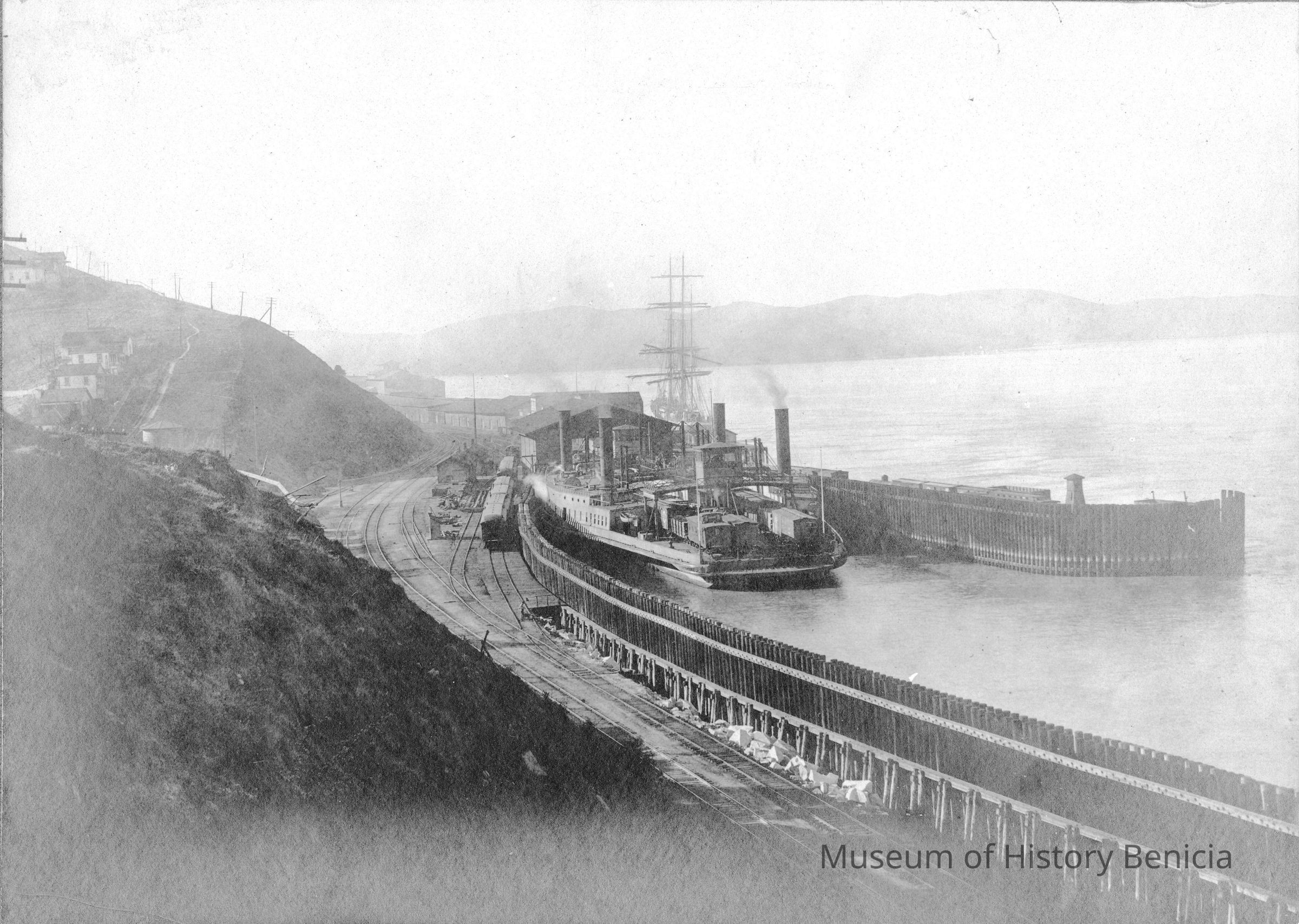 Glass covered photo mounted on black construction paper. Shows a ship docked at port in Port Costa. The back says "The Solano".