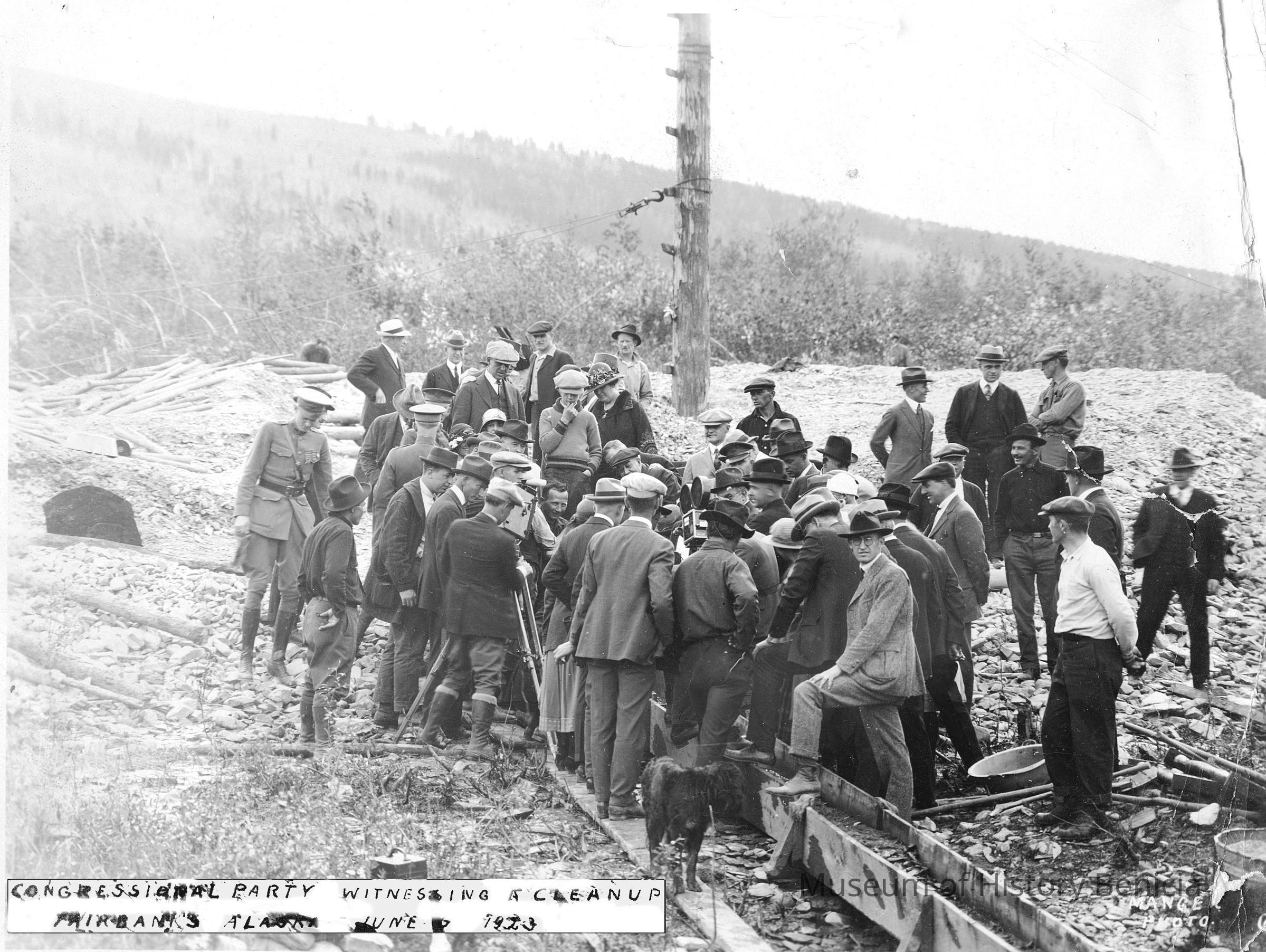 Photograph of inscribed "Congressional Party Witnessing a clean up Fairbanks Alaska June 6 1913. This is obviously a clean out of a gold sluice box.Collection