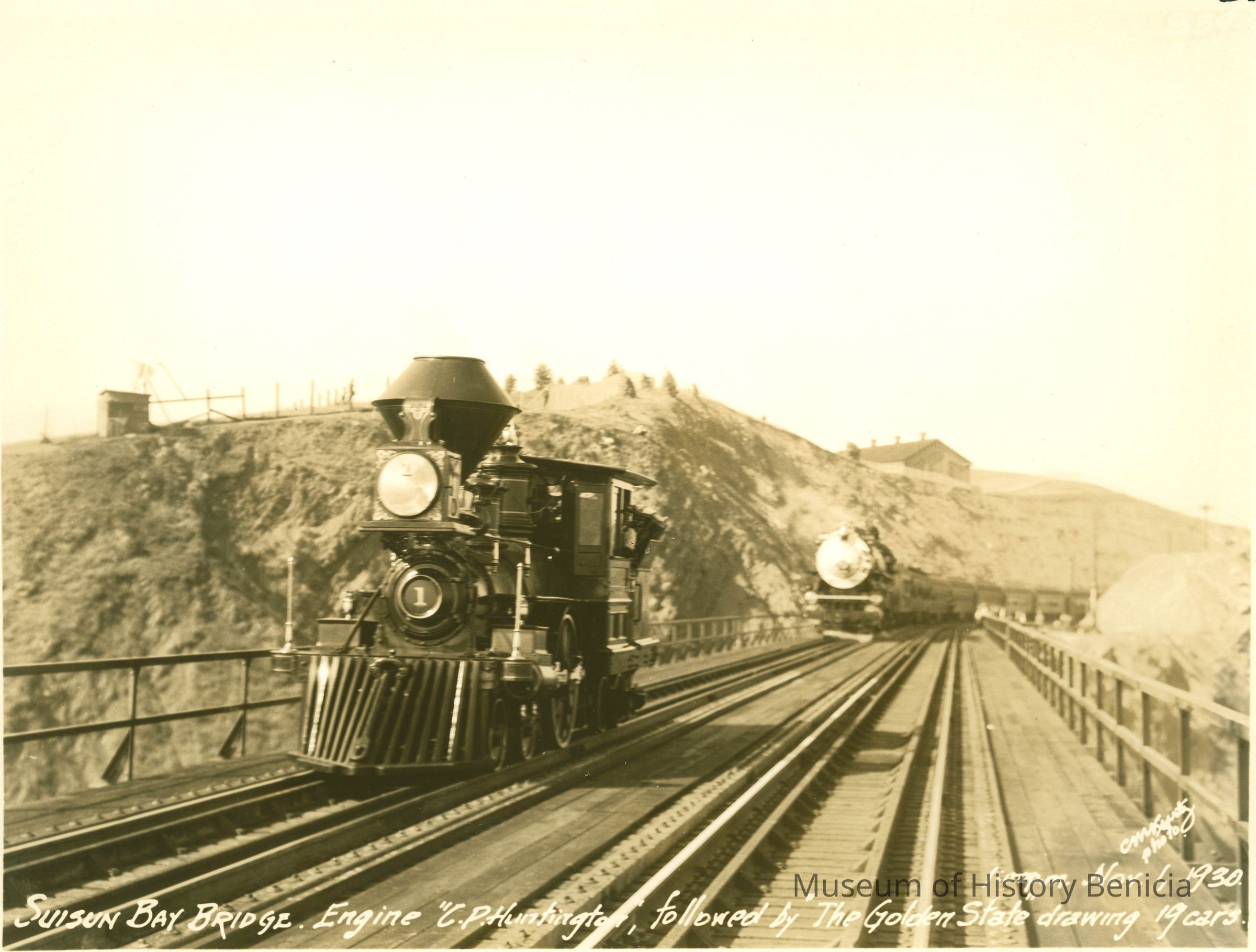 inscribed Suisun Bay Bridge Engine "CP Huntington followed by the Golden State drawing 19 cars. Nov 1, 1930C M Kurtz PhotoCollection
