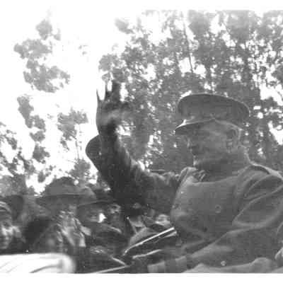 Photo of General Pershing on steps of a house.