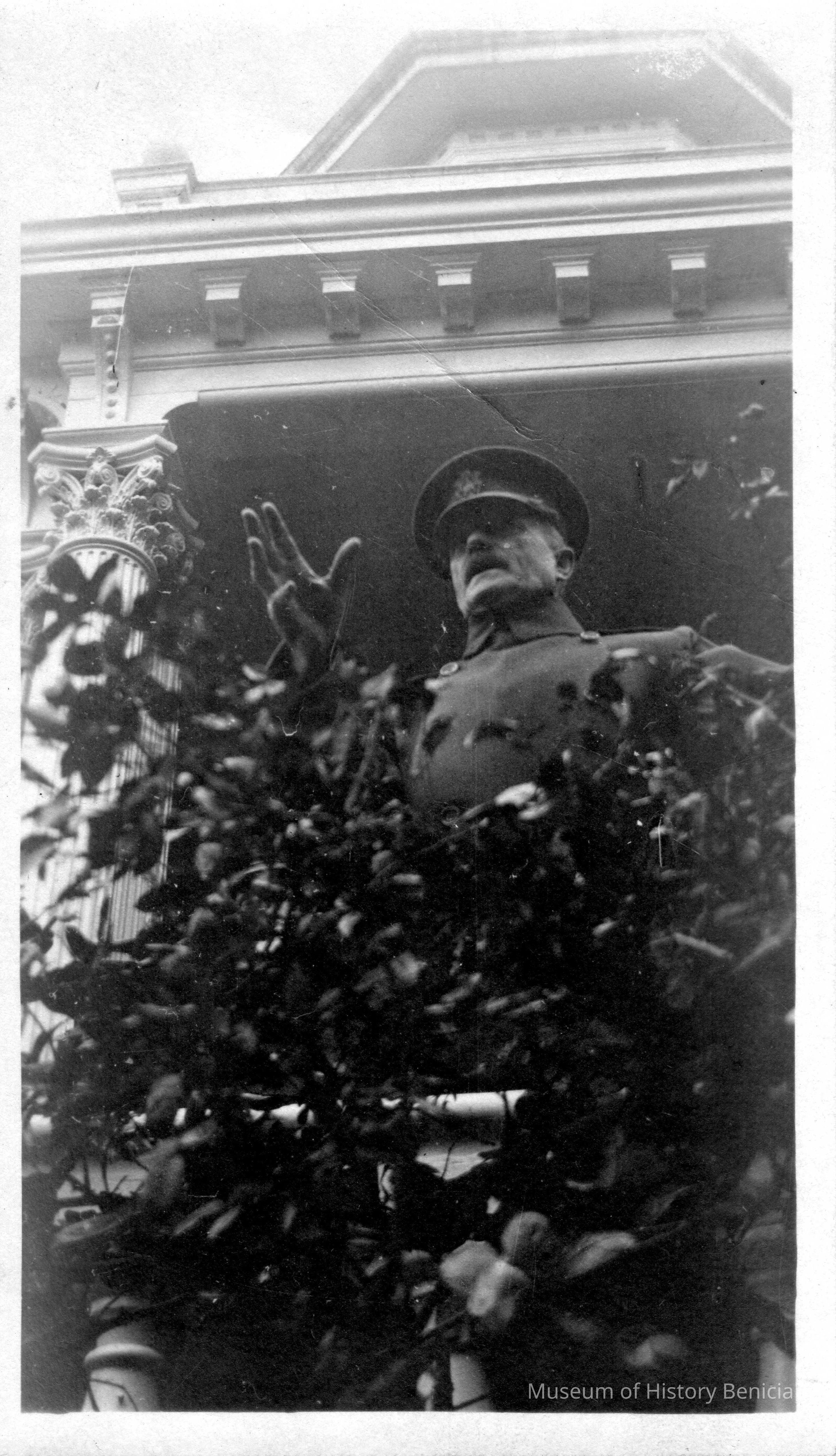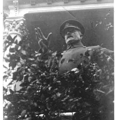 Photo of General Pershing on steps of a house.