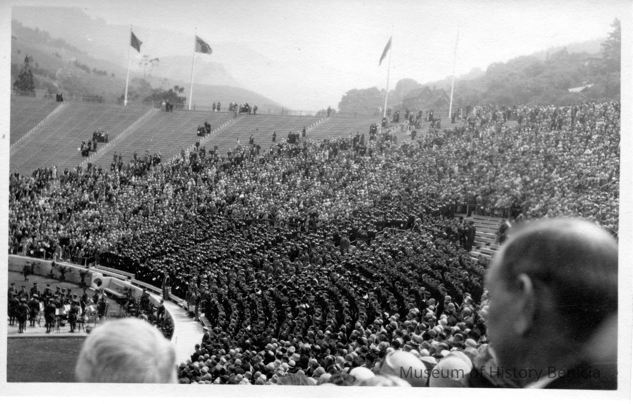 Photo of people in a stadium. Looks like they are honoring some people in the military. The stadium could be Cal's memorial stadium which was built to honor the fallen in World War I. This could be a ceremony after it was completed in 1923.Collection