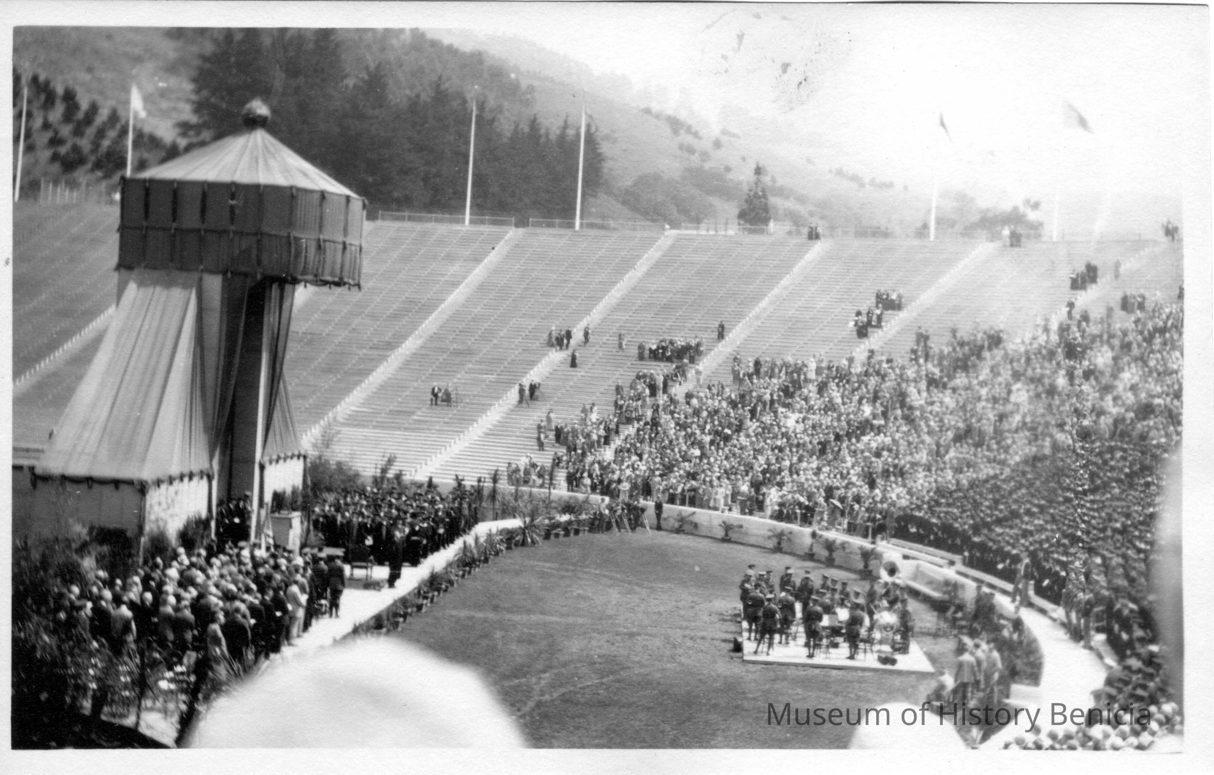Photo of people in a stadium. Looks like they are honoring some people in the military. The stadium could be Cal's memorial stadium which was built to honor the fallen in World War I. This could be a ceremony after it was completed in 1923.Collection