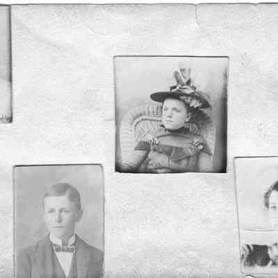 Photo of people. Photos are on small 1" square photos attached to what was a small photo album. The pages are 5" x 2.25".