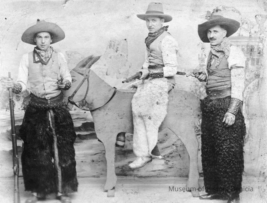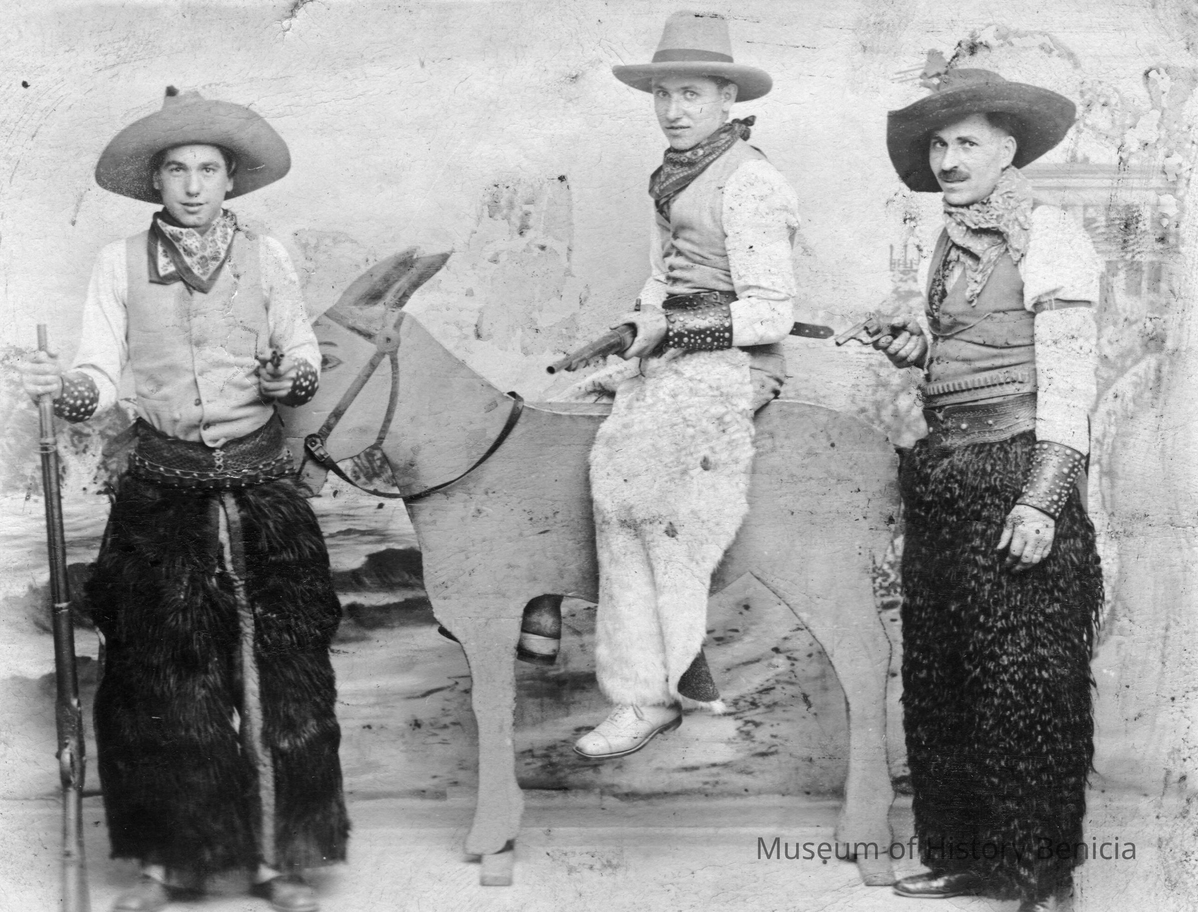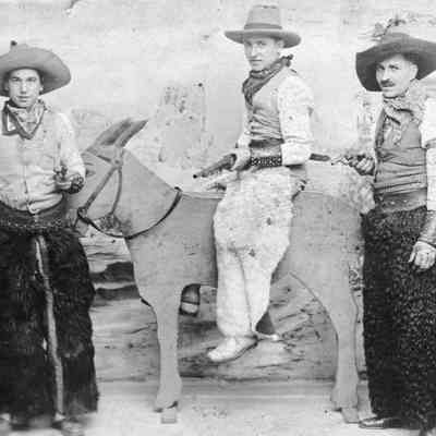 Photo of men dressed as cowboys holding guns. This is probably an Oldtimers celebration in Benicia. The photo is on a postcard stock. One man is sitting on a fake donkey.Collection