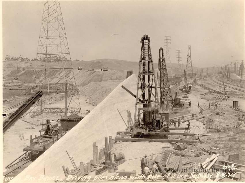 caption is: Suisun Bay Bridge Driving piles along south side of "W" line subway