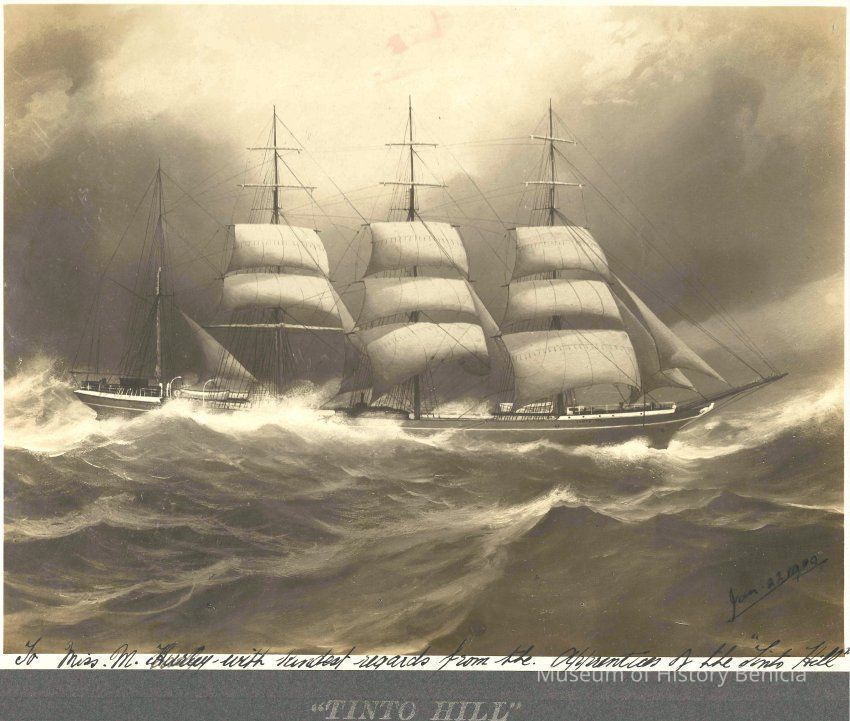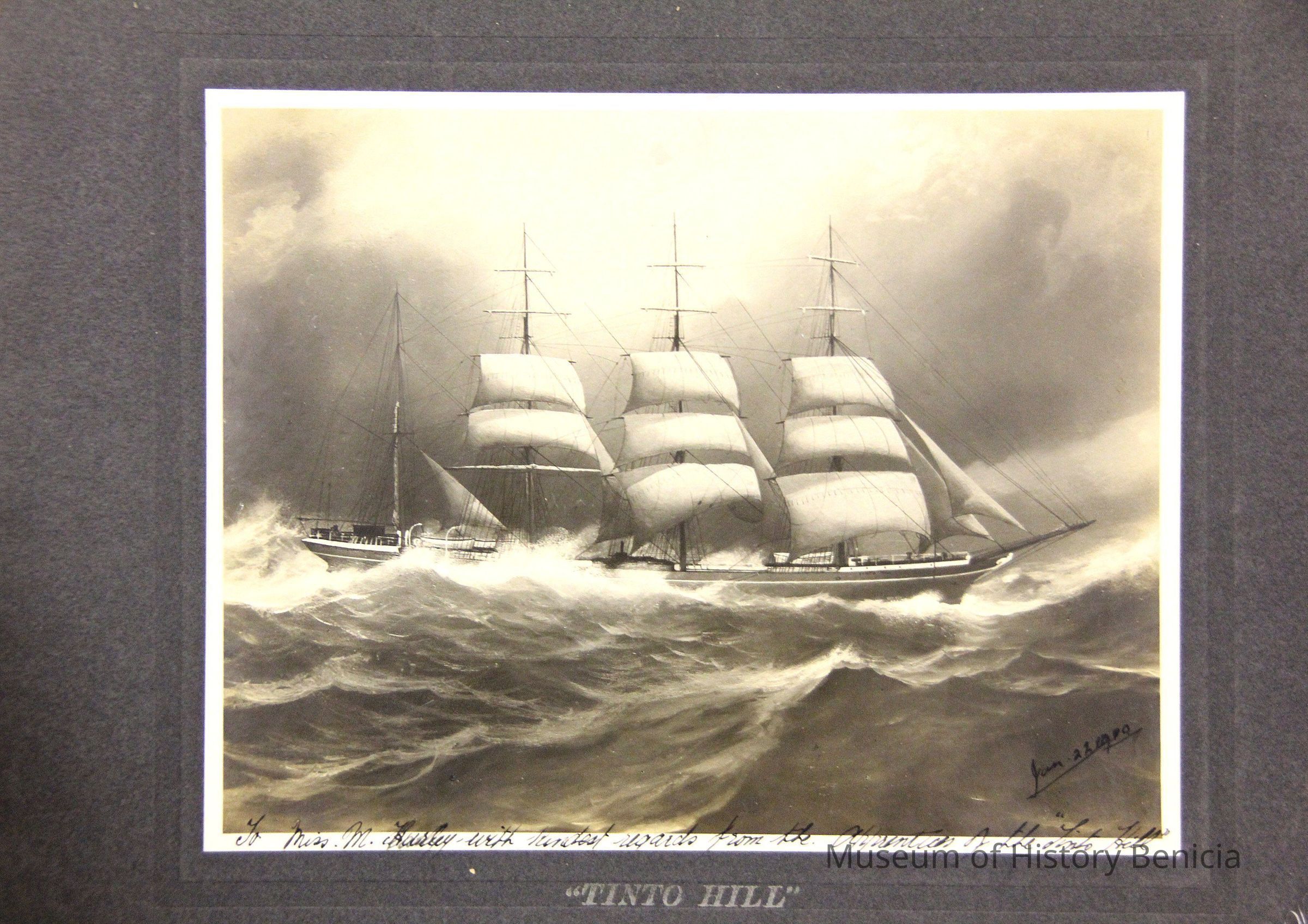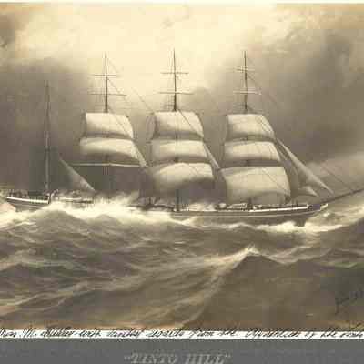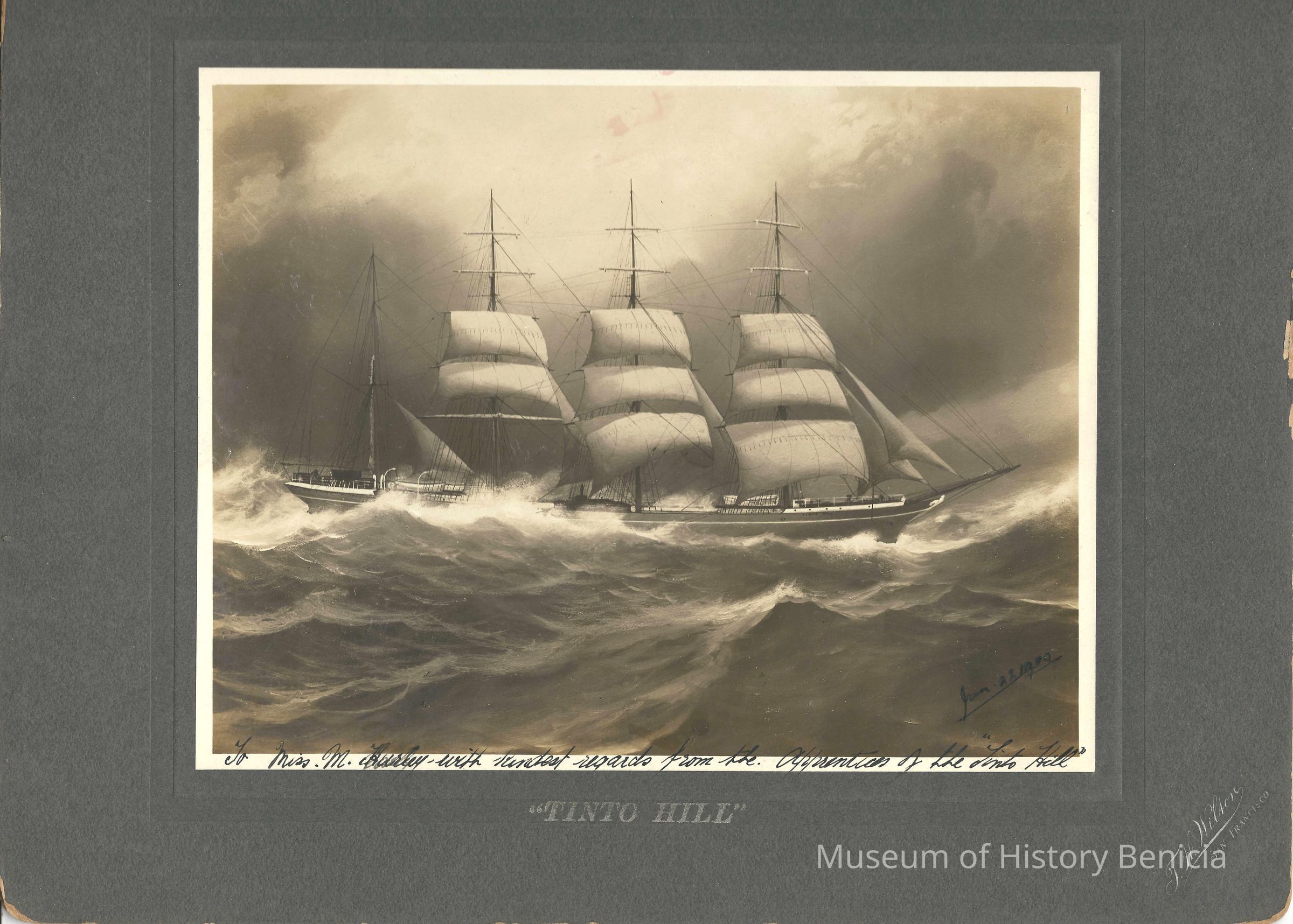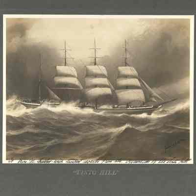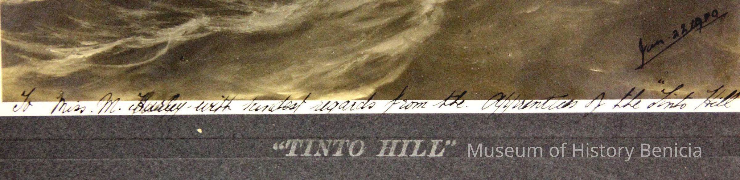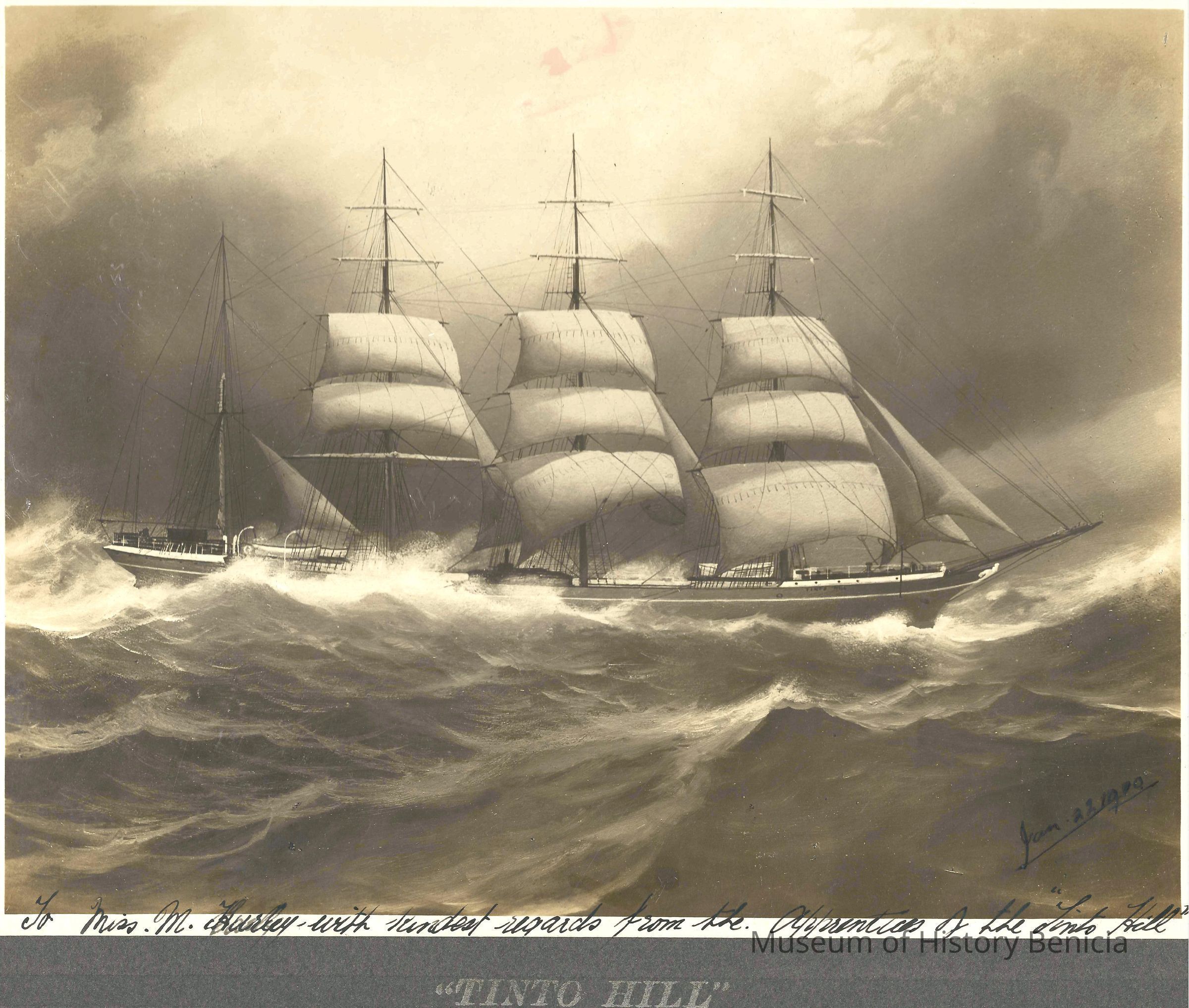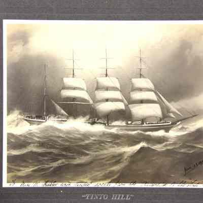 Photo of a ship at sea dated Jan 22, 1909. The printed title says "Tinto Hill". Written in the margin is "To Miss M Hurley with kindest regards from the apprentices of the Tinto Hill". Written on the back is Mrs Leo McGrait.