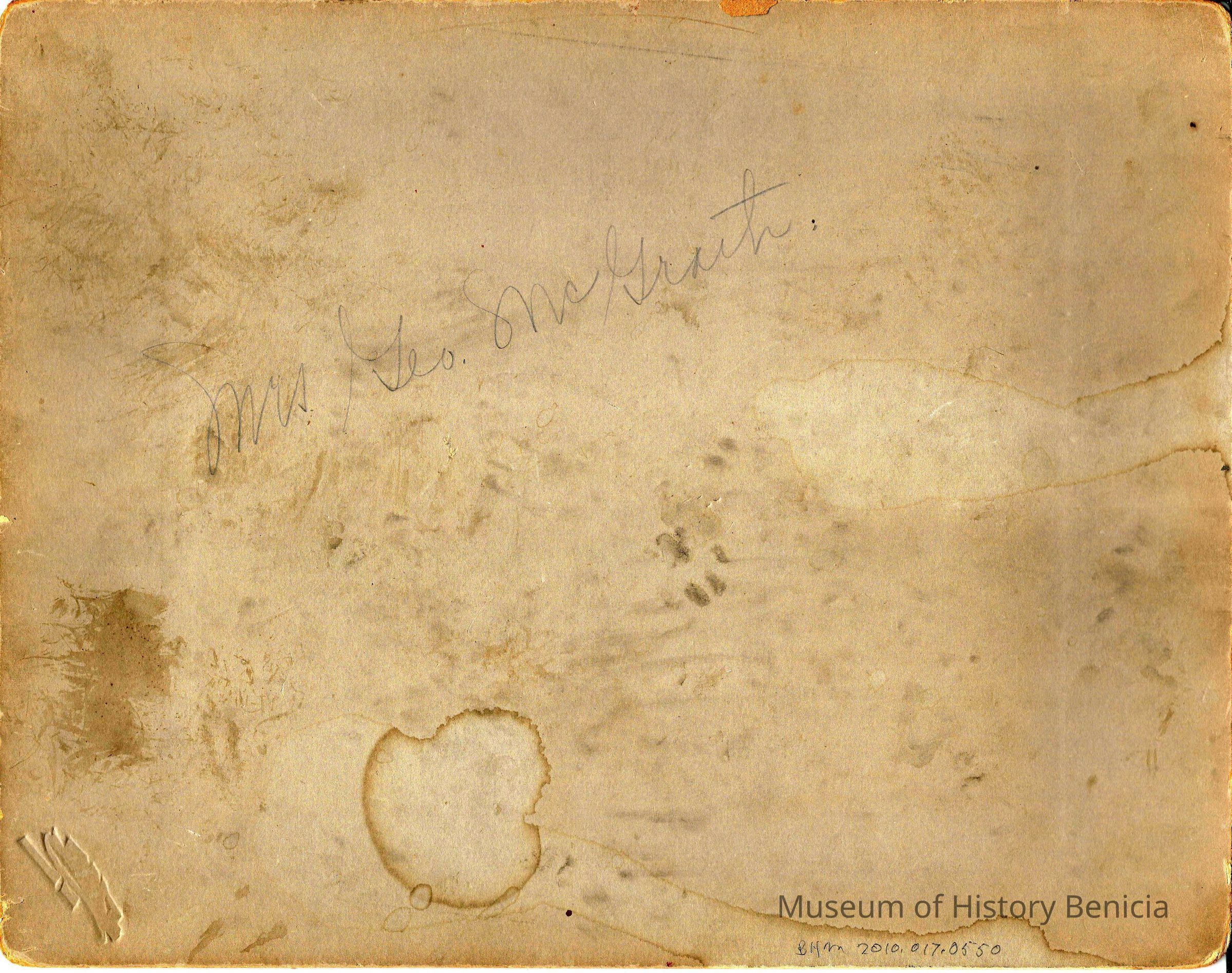 The photo is inscribed to Miss Hurley. This is probably Mary Hurley born in California in June, 1883. She was the daughter of Kate Hurley (05/1854) the Postmistress of Port Costa from 10/27/1888 to 1915. Mrs Hurley was a widow who came to the US from Ireland in 1872 and was naturalized in 1883. The US Register of Civil, Military and Naval Service 1863-19+59 shows that she was paid $549.75 in compensation for the year ending 07/01/1889.