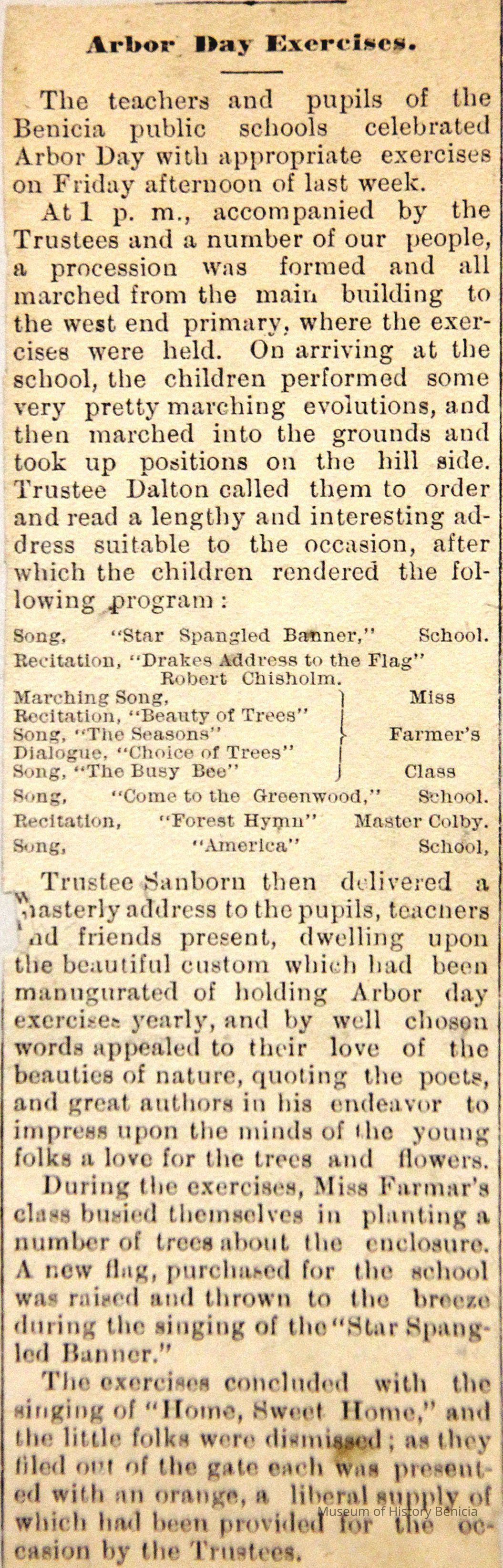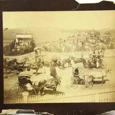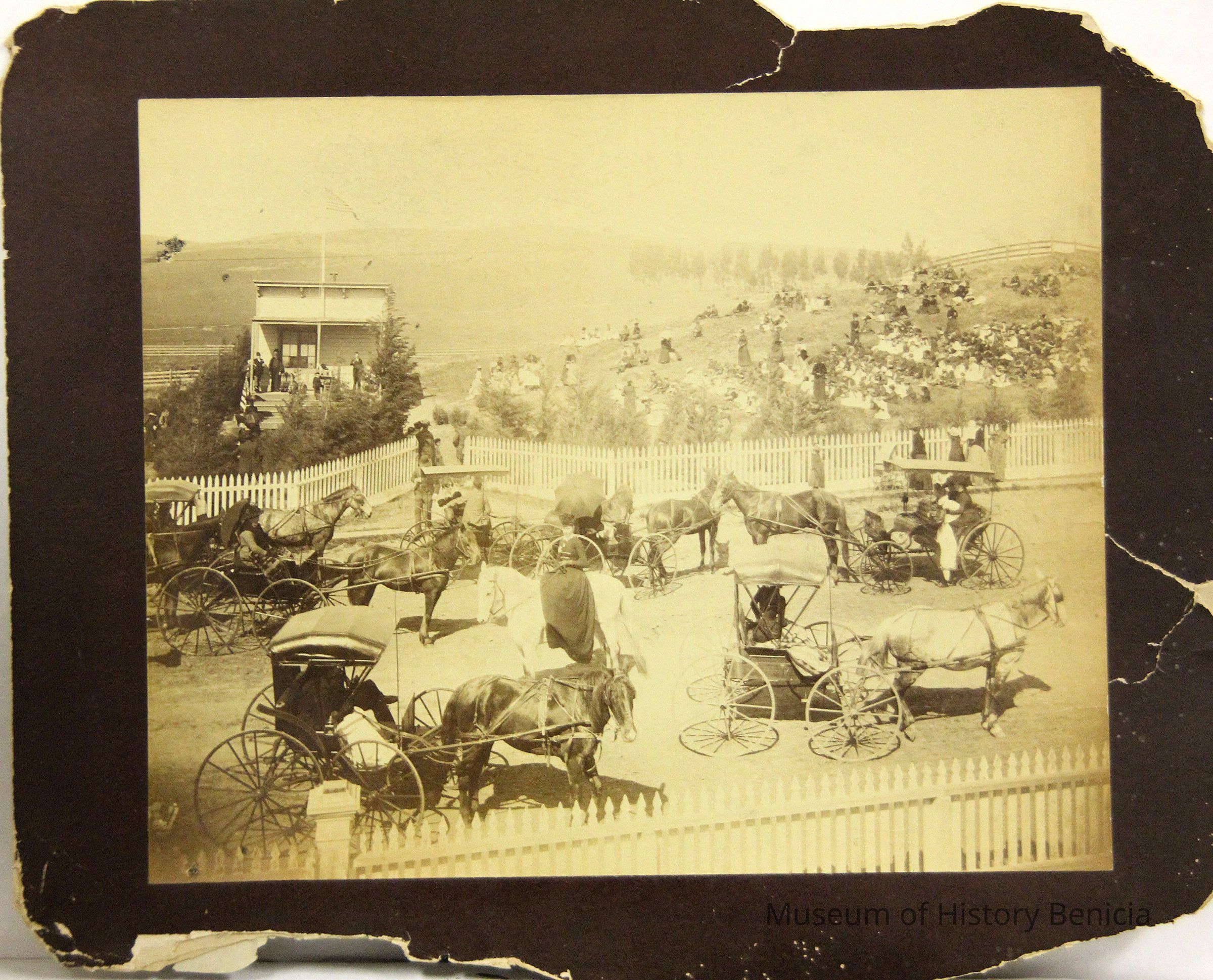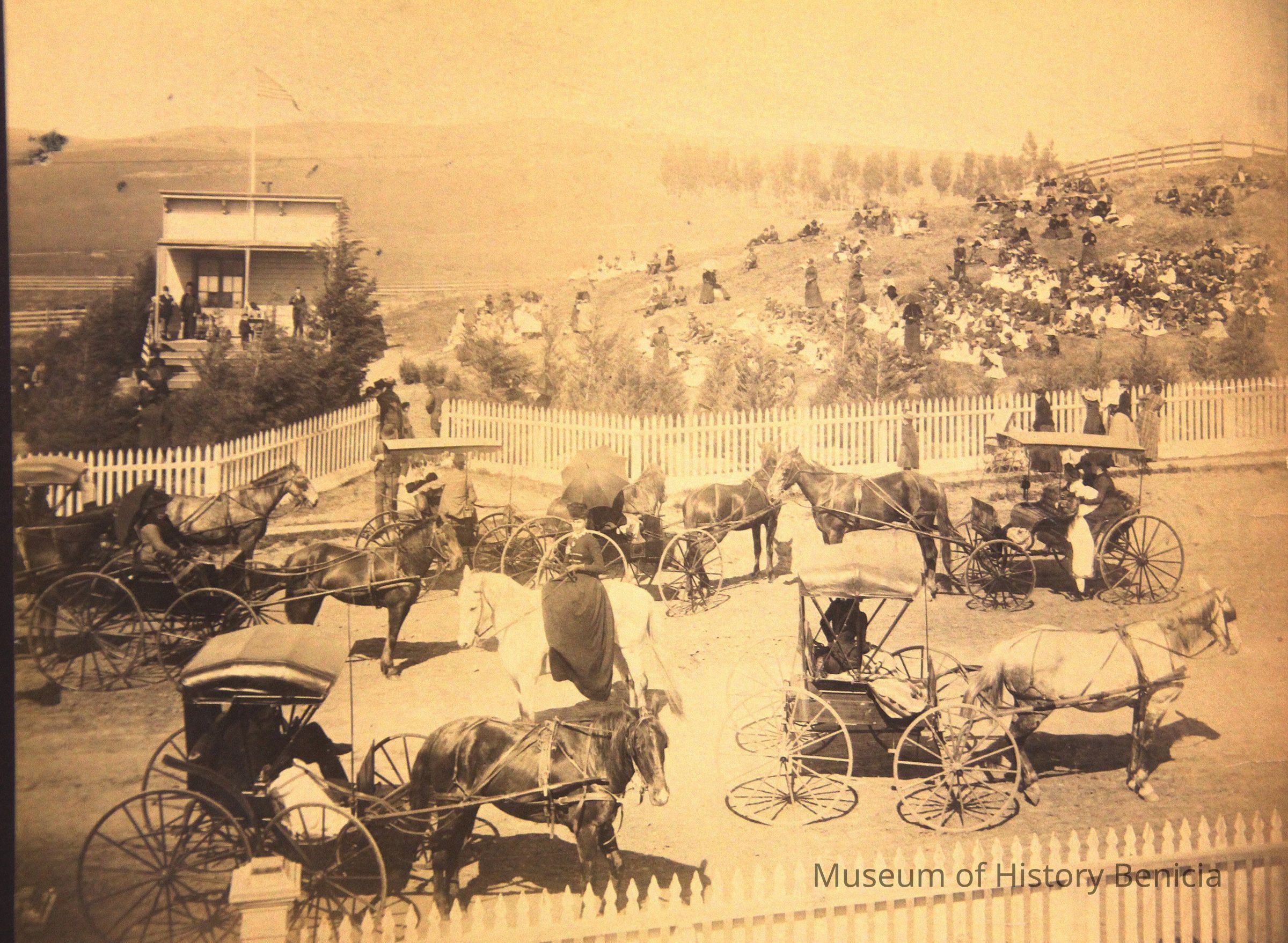 Photo of people gathered around an old school building. There are people in horse and buggies, some sitting on the hillside. Ther newspaper article on the back says they are celebrating Arbor Day. They mention Miss Farmar's class (she is in another class photo we have). Also on the back is a stamp for the Benicia Herald and the annotation 4 col. There is no year shown on the photo but our other photo of Miss Farmar's class is dated 1893.Collection