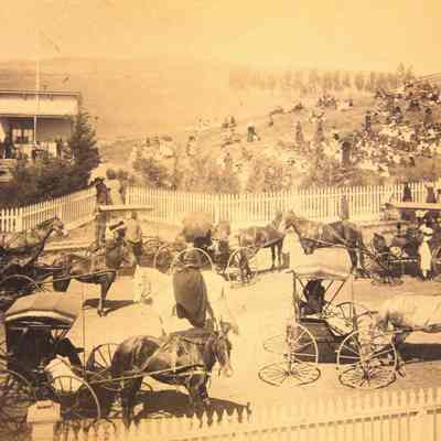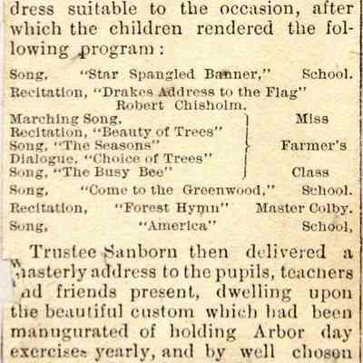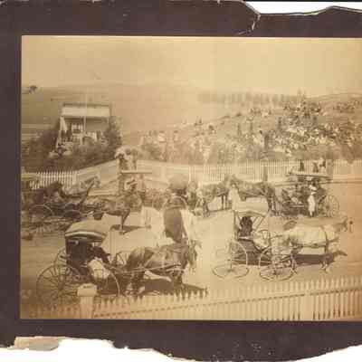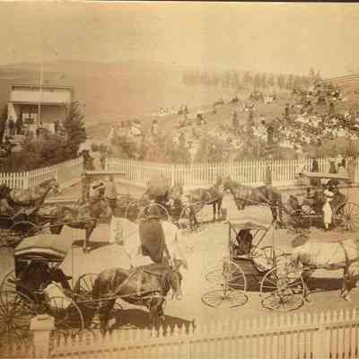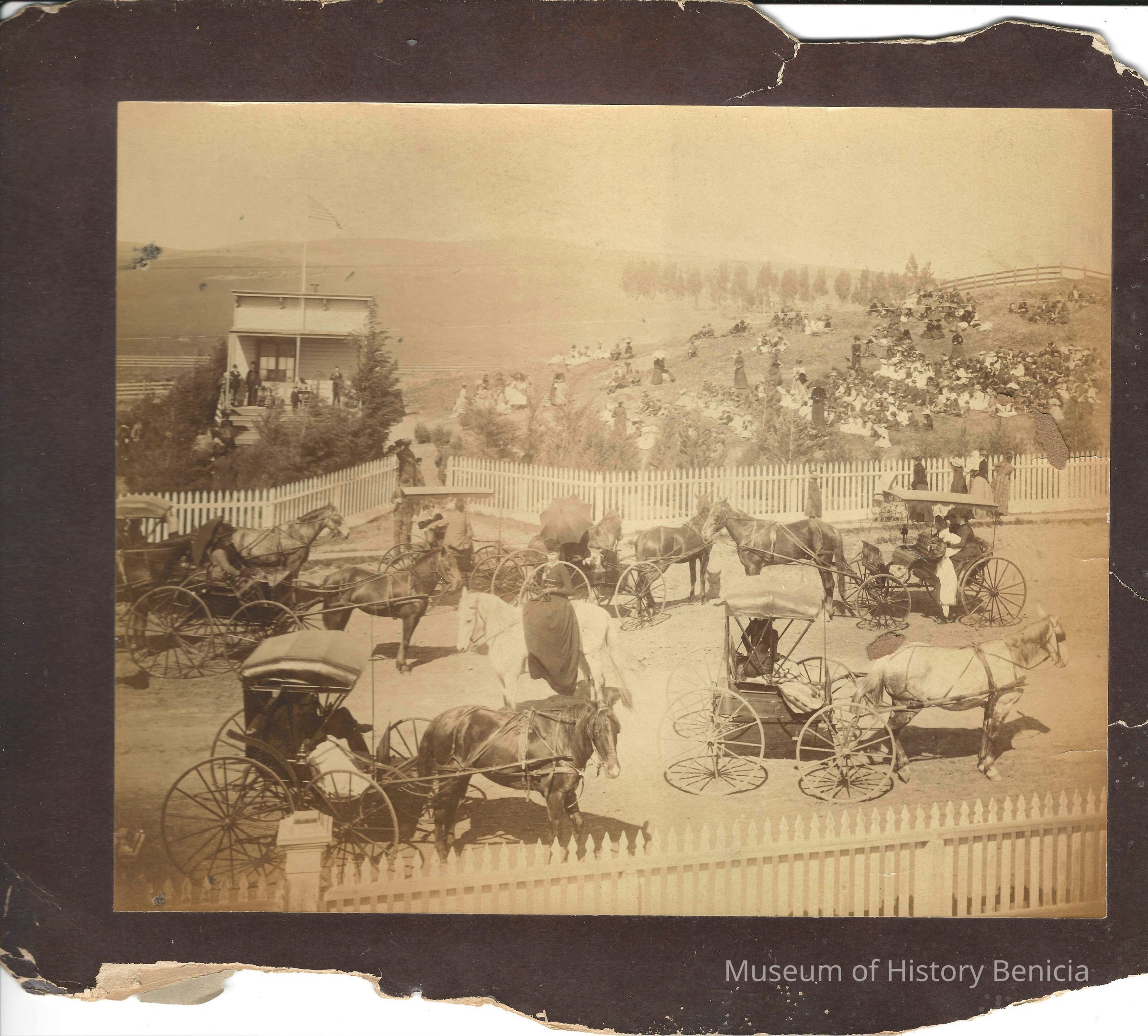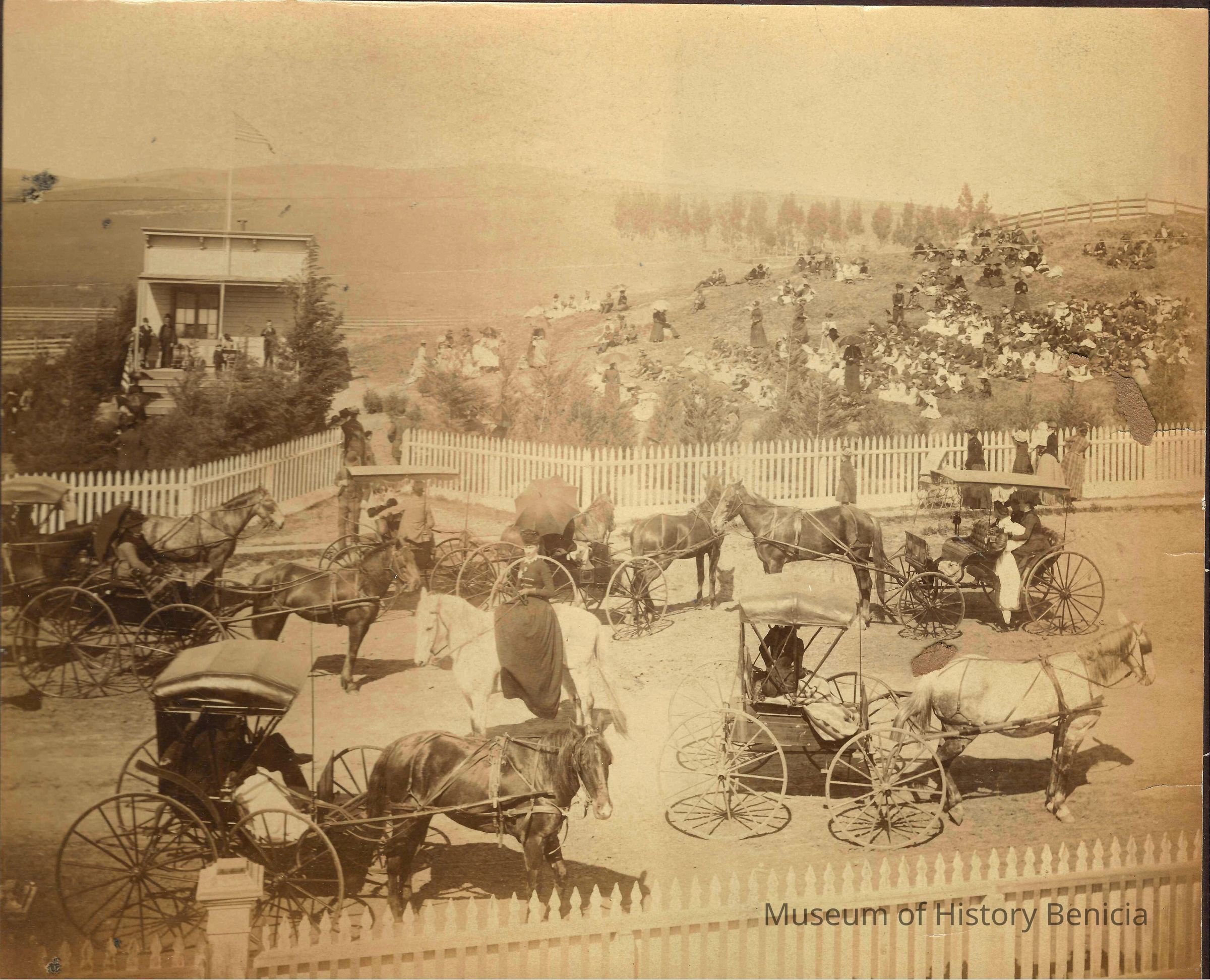 Photo of people gathered around an old school building. There are people in horse and buggies, some sitting on the hillside. Ther newspaper article on the back says they are celebrating Arbor Day. They mention Miss Farmar's class (she is in another class photo we have). Also on the back is a stamp for the Benicia Herald and the annotation 4 col. There is no year shown on the photo but our other photo of Miss Farmar's class is dated 1893.Collection