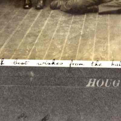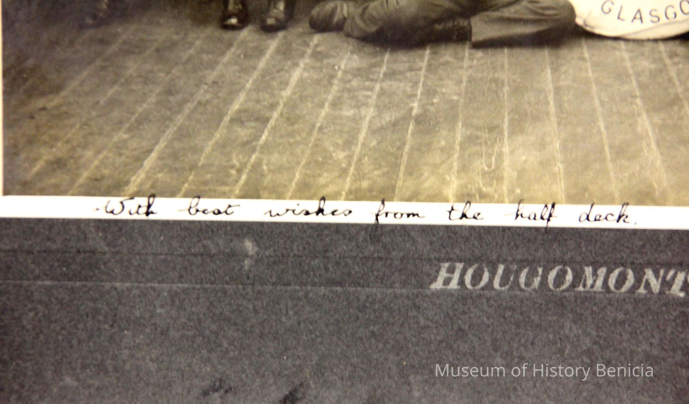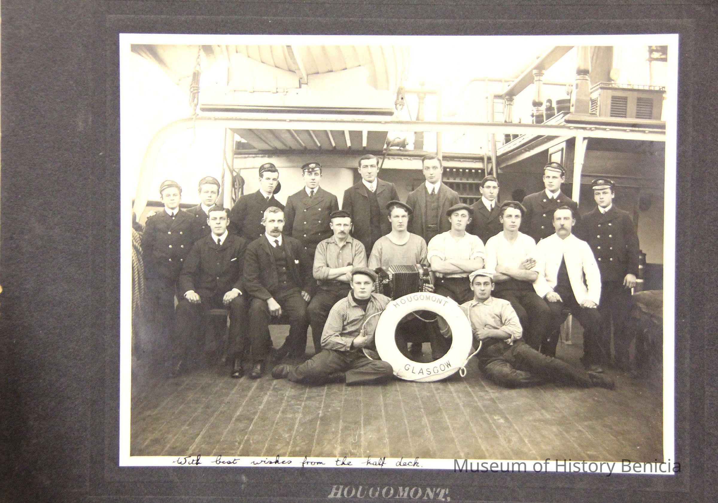 Photo of a ship's crew . The printed title says "Hougomont". The margin inscription says With best wishes from the half deck.