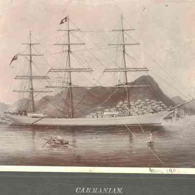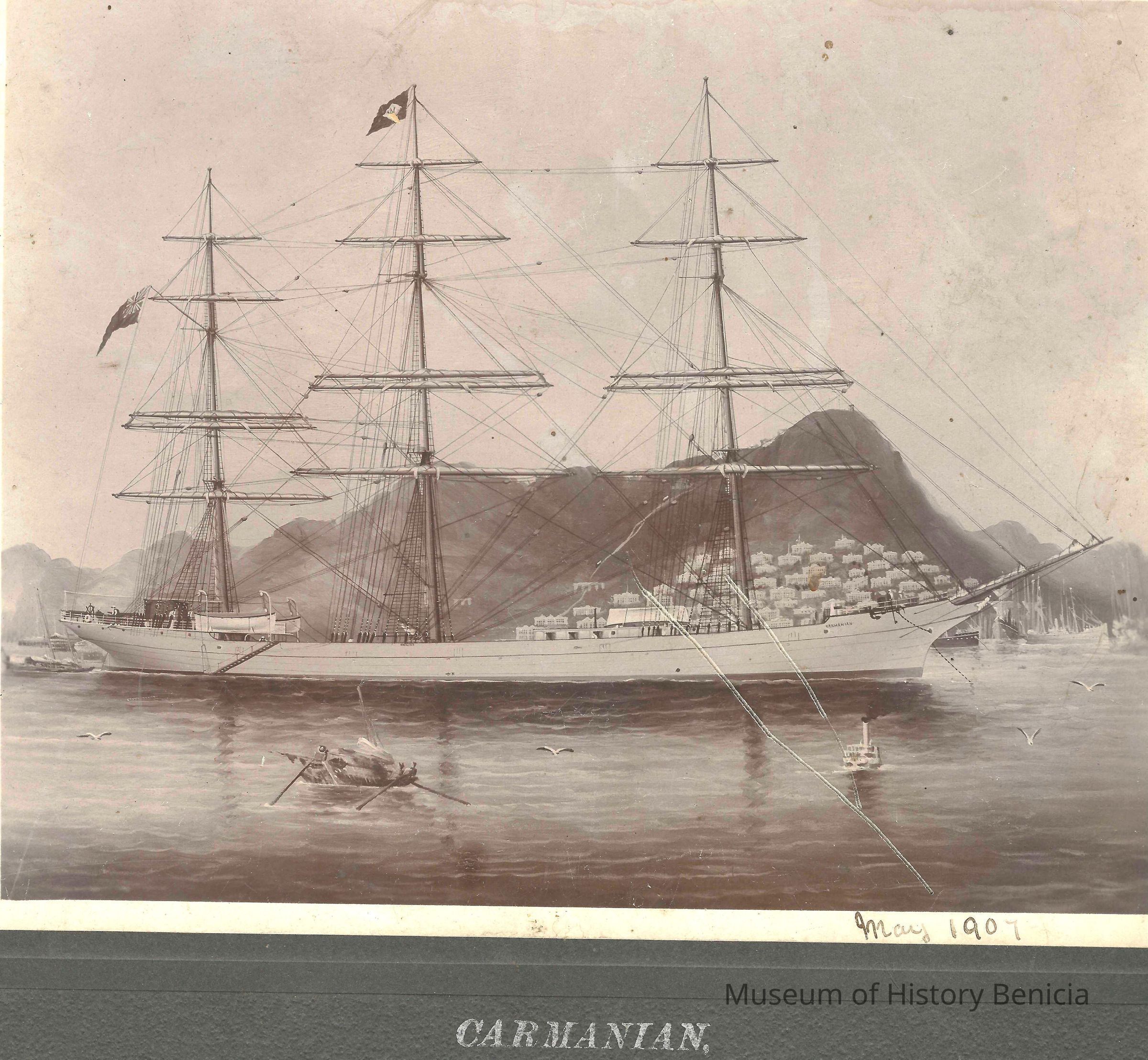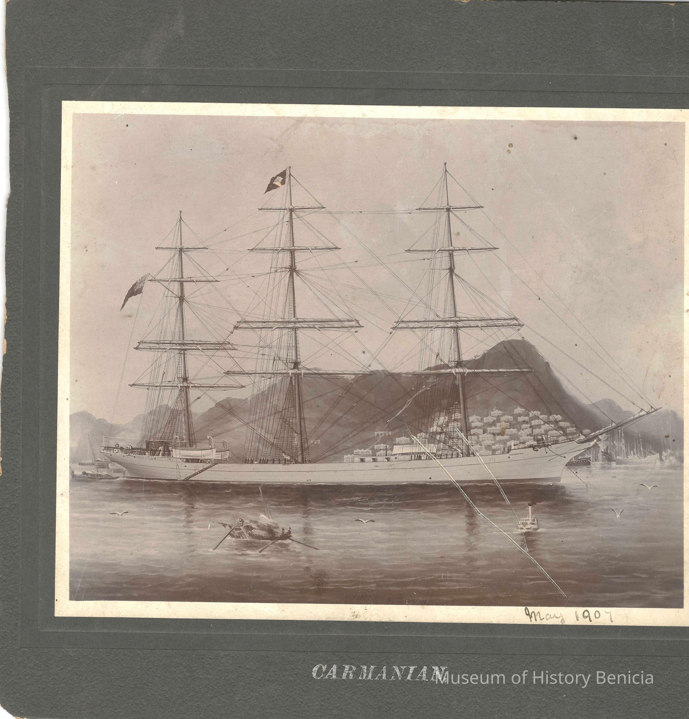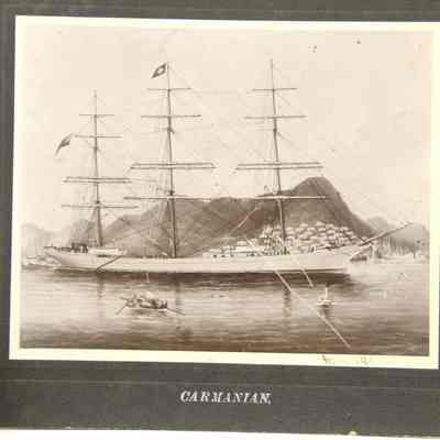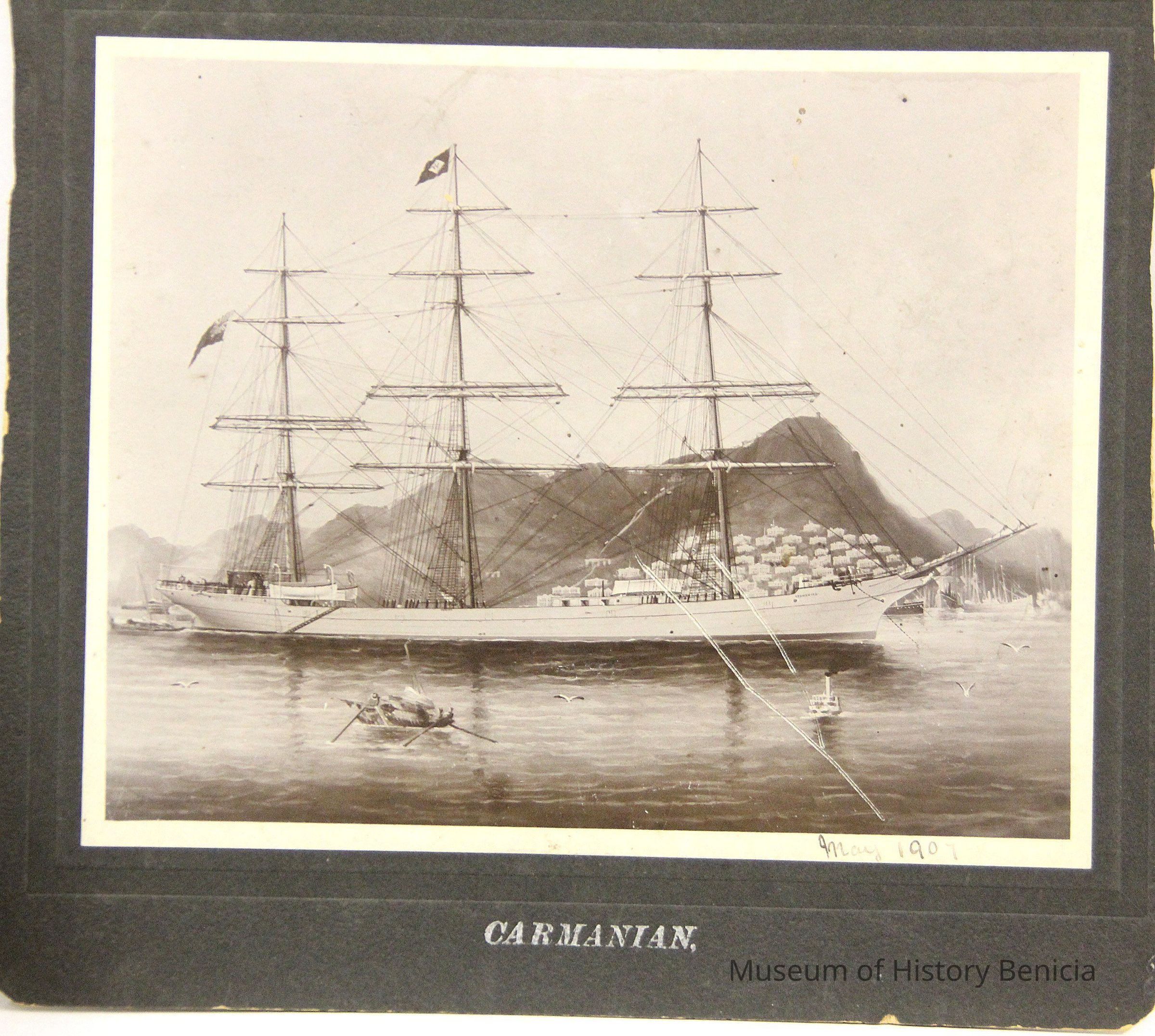 Photo of a ship at sea . The printed title says "Carmanian". The margin inscription says " May 1907". The photo has been cut down on both sides. It also looks like a painting and not an actual photo.