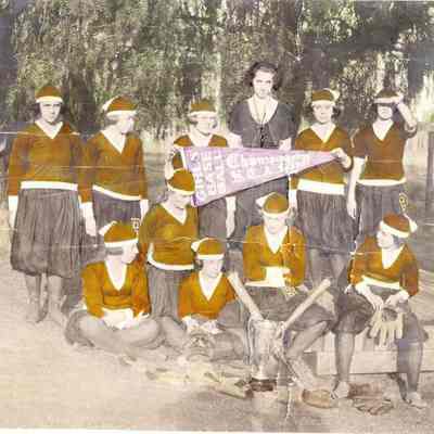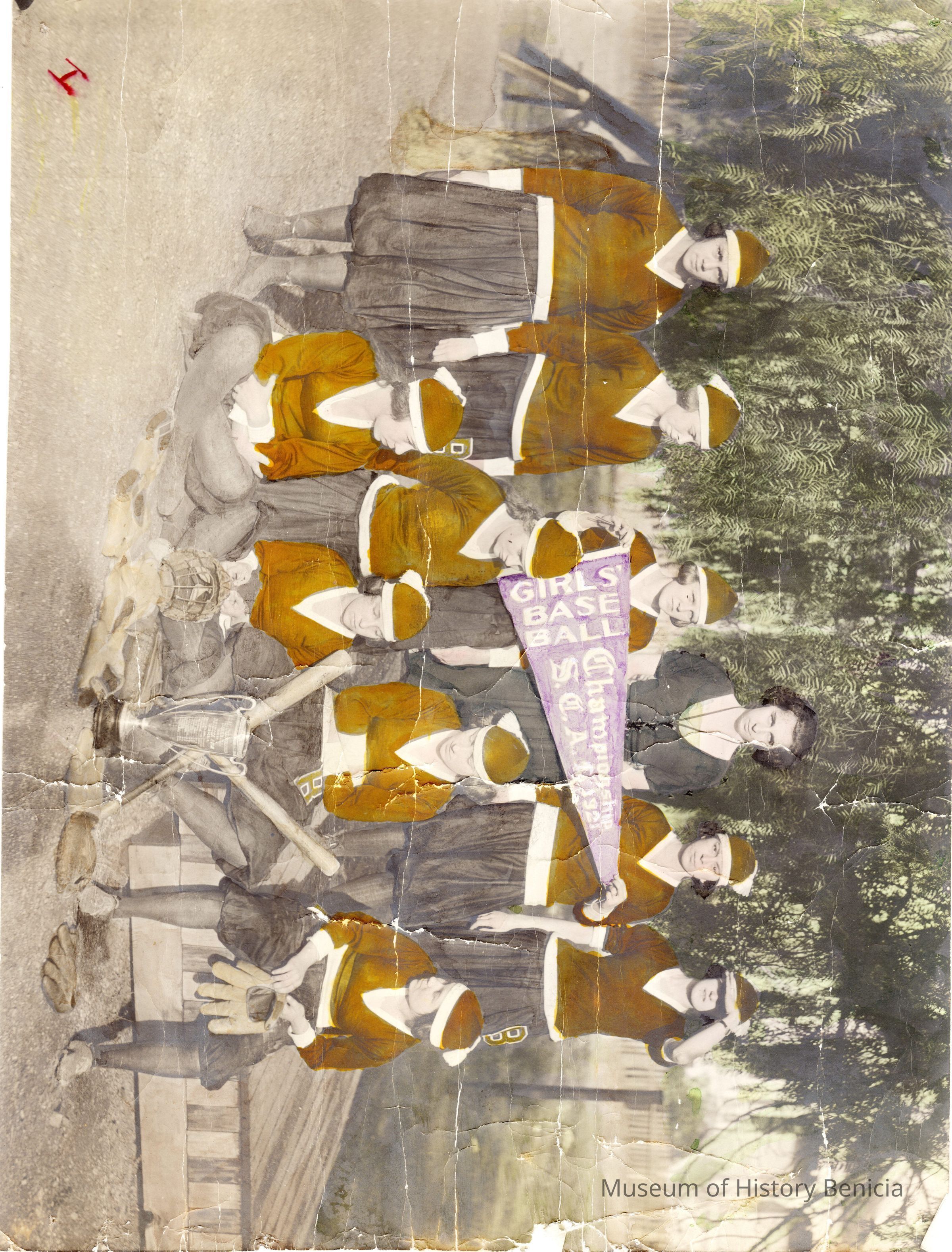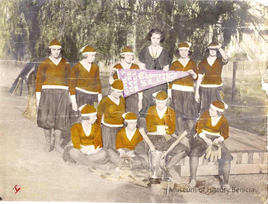 Photo of Benicia High School women's championship baseball team from 1921. SCAL champions. The photo is colorized and has names on the back. We have two copies. The second one is in the donor file.