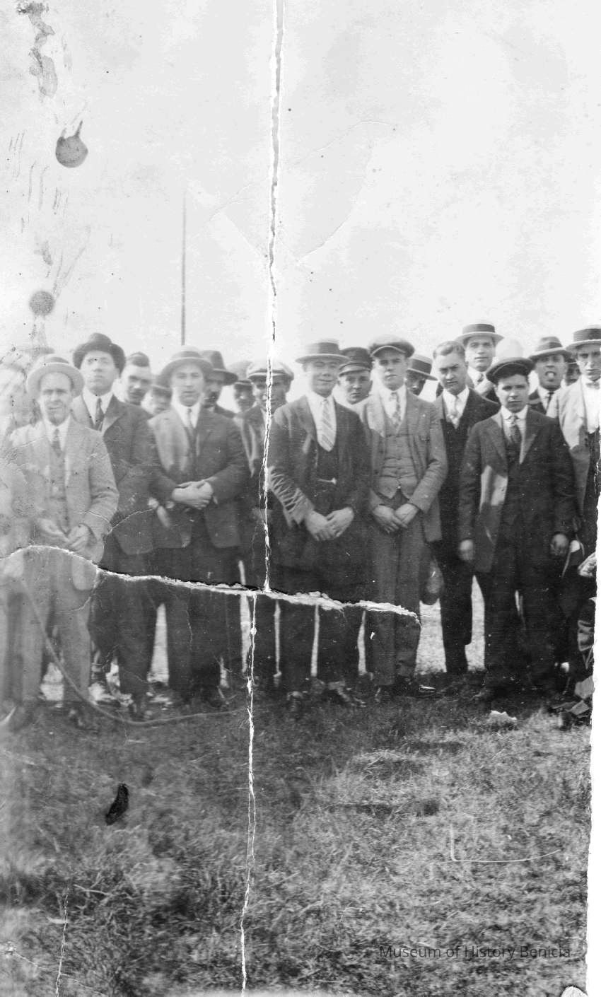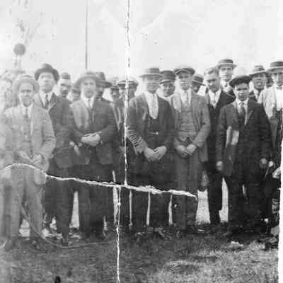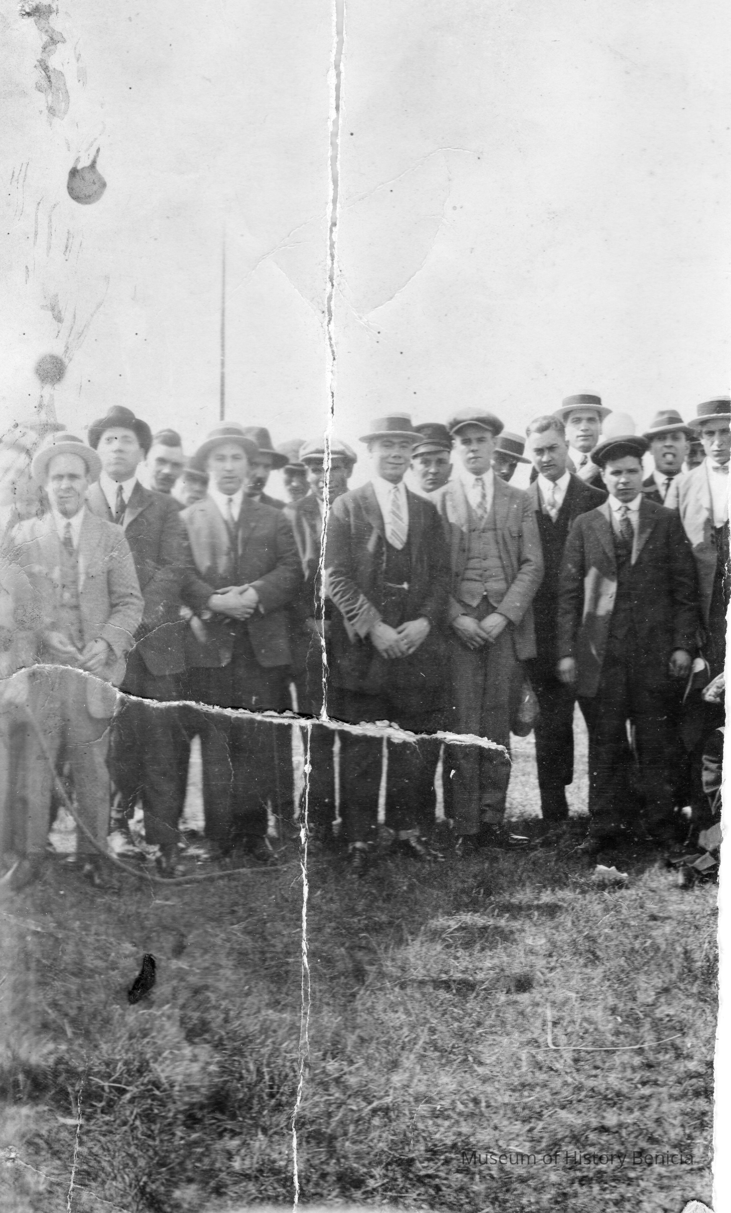 photo of a group of men. The photo is torn.