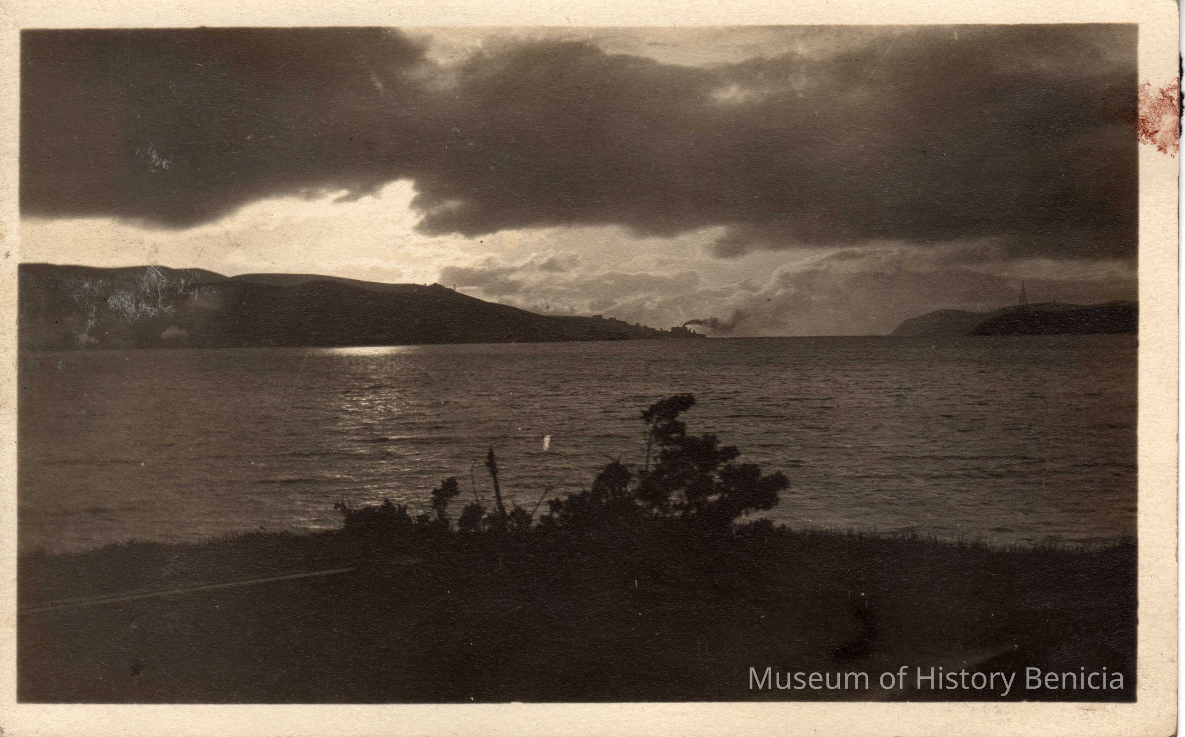 Photograph postcard of Carquinez Strait, looking to where bridge is now. Train in the distance. Some paper glued to the back. Pre 1927. Some staining.Collection