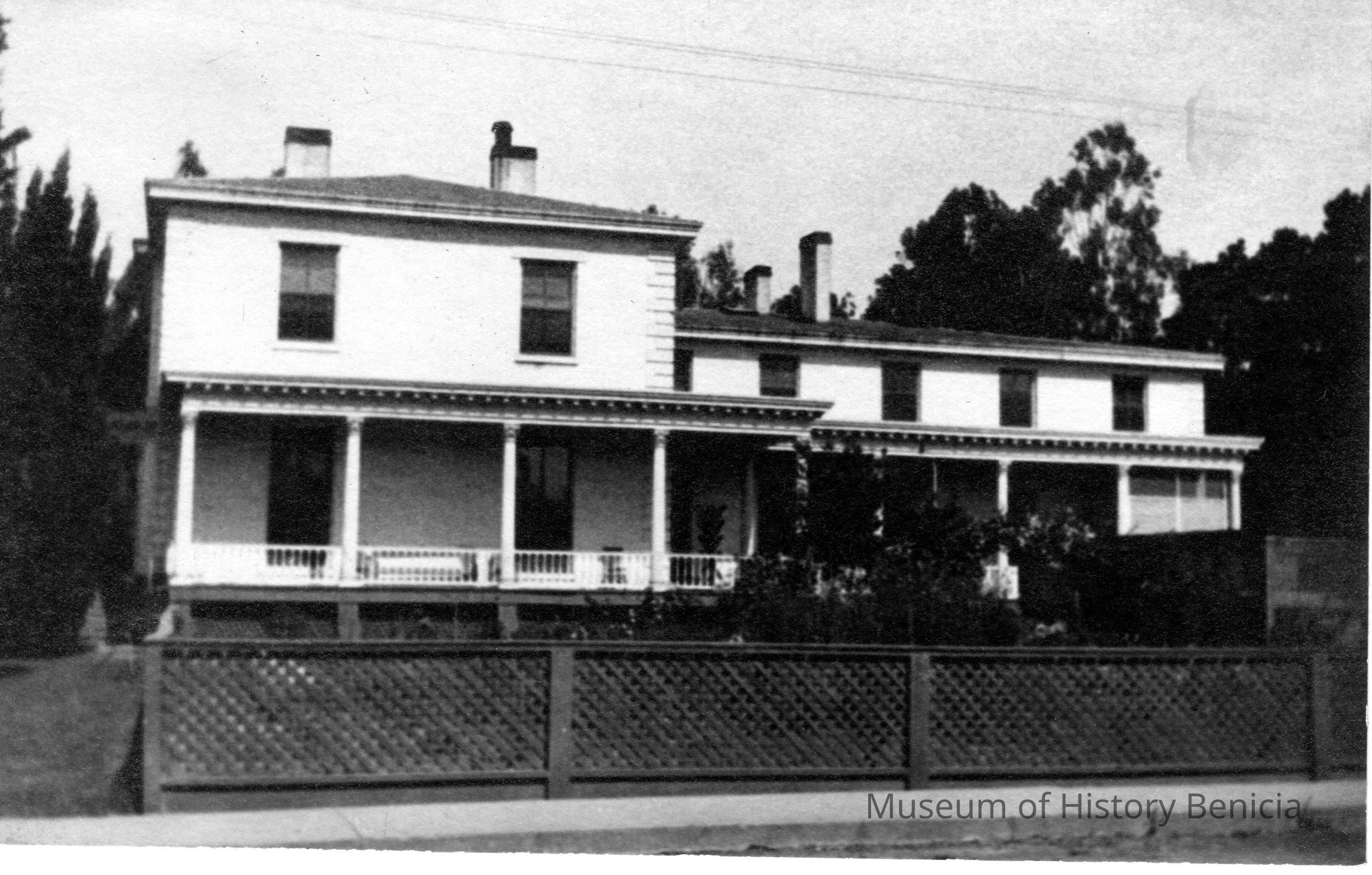 Photograph of a house. May be in Benicia. Some paper is glued on the back.