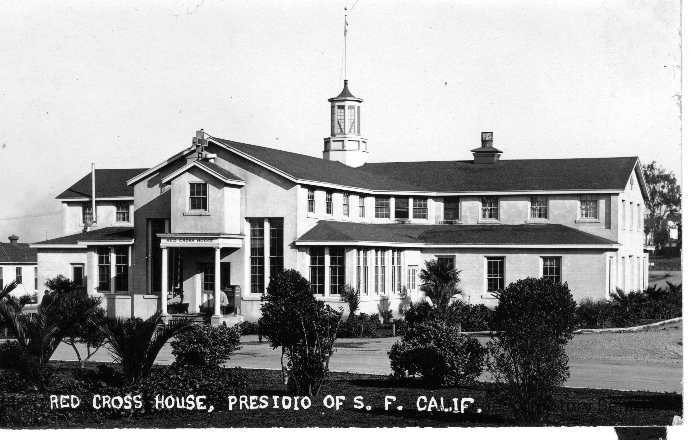 Photograph of the Red Cross House in the Presidio of SF. Handwritten caption in white ink. Some paper glued to the back.