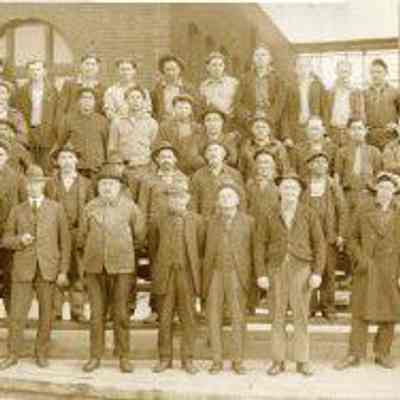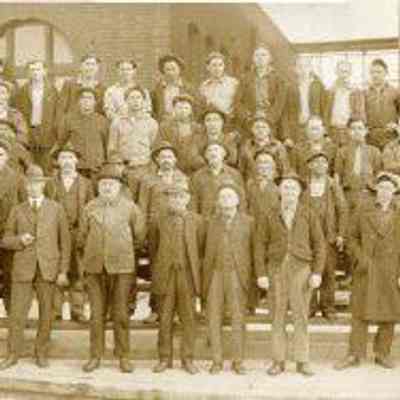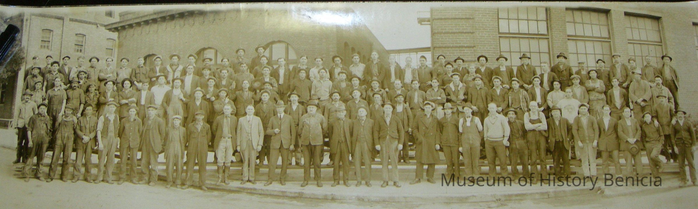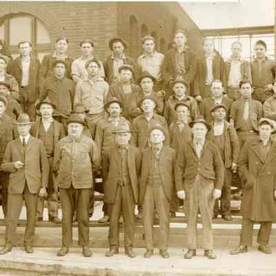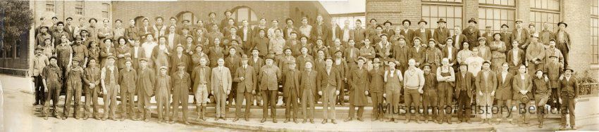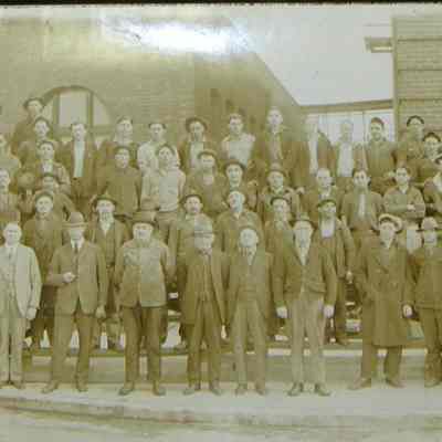 B/W photograph of Kullman Salz tannery workers - roughly four rows of over 100 men (maybe as many as 120) in various types of dress (suits, laborer clothing) standing in front of the tannery buildings